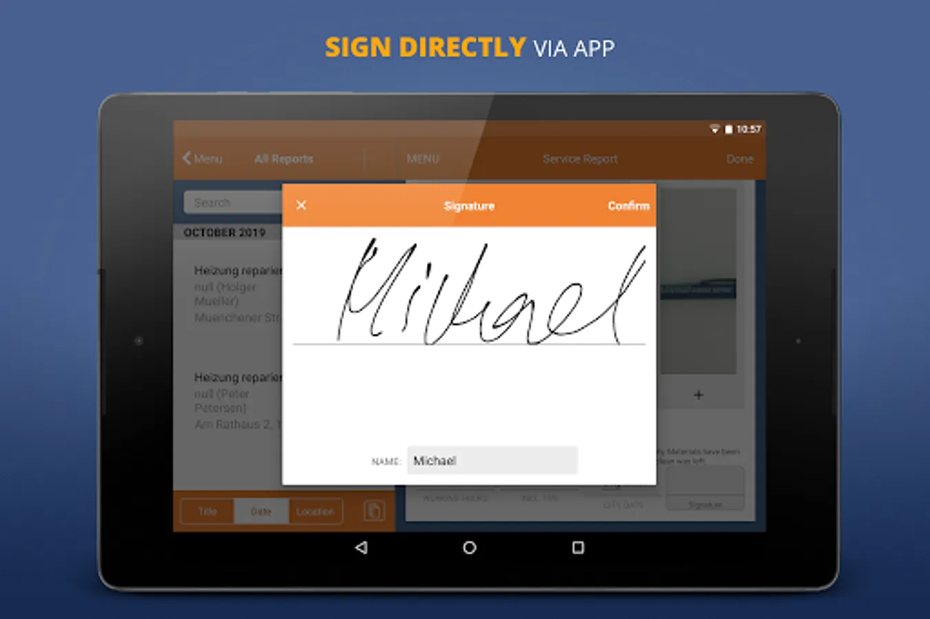 The app for craftsmen, service technicians, maintenance & field service to create & sign digital service reports on smartphone or tablet. Immediately during field work with your client. Mobile, digital, simple, fast & secure.