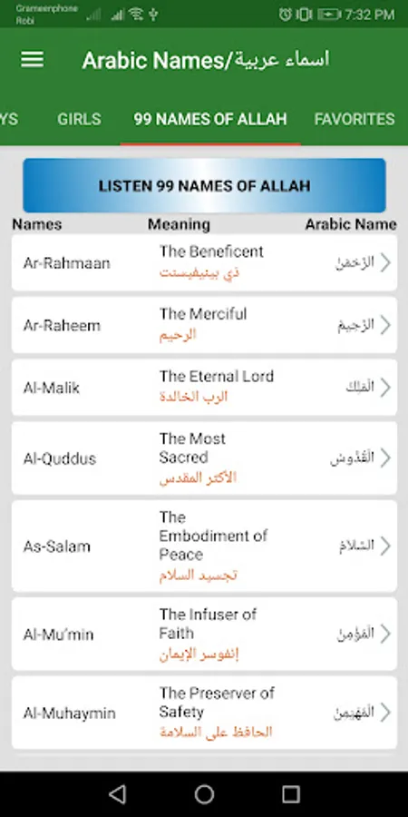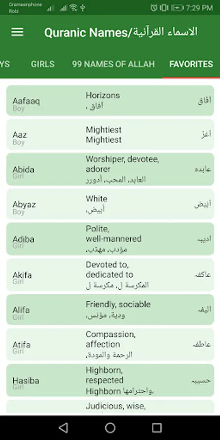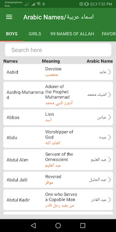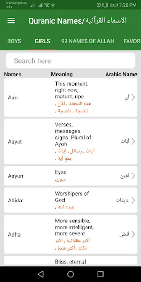 Arabic Baby Names app provides a great collection of Muslim names with their meanings. It is a great help to choose a name for your baby ( girl or boy) which is gonna like by everyone. You can also easily search name according to their alphabets or when you just want to know the meaning of your name. Also you can able to add name in your favorites list.