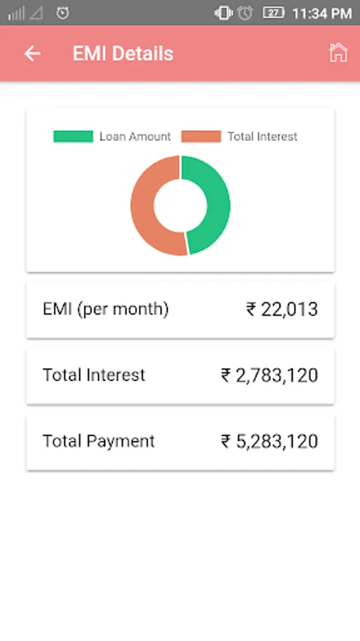 EMI amount and interest to be paid details are shown in a simple colourful chart as well as numbers.