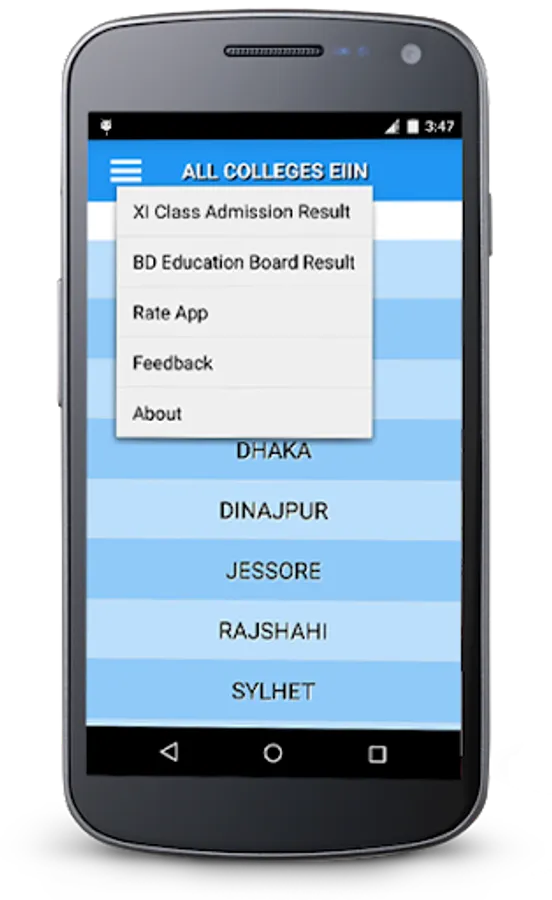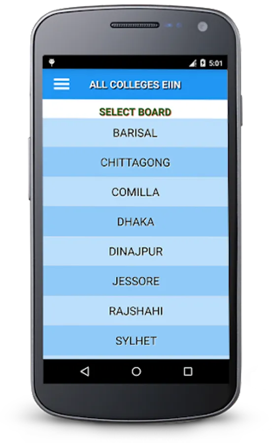 A simple application with a list of all the Education Boards of Bangladesh.When you click on board name, you will see the all Colleges EIIN Number (Educational Institute Identification Number) about selected board.This application is useful to get admission in class xi.