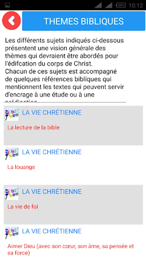 The various topics given in the Bible Theme Application present an overview of the topics that should be addressed for the edifying of the body of Christ. Each of these topics is accompanied by some biblical references that mention the texts that can be used to inking a study or preaching. These text proposals are not exhaustive and it is possible to find more references in a Bible concordance.
