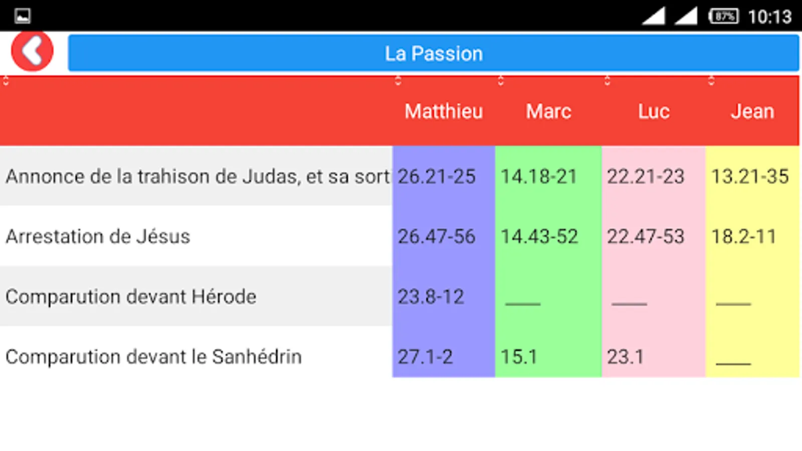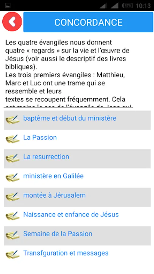 the description of the biblical books). The first three Gospels: Matthew, Mark and Luke have a frame that looks and their texts frequently overlap. This is less the case of the Gospel of John which presents Christ and his ministry as a symbolic vision. Bible Theme allows you to find the different texts according to the chronology of Jesus' life.