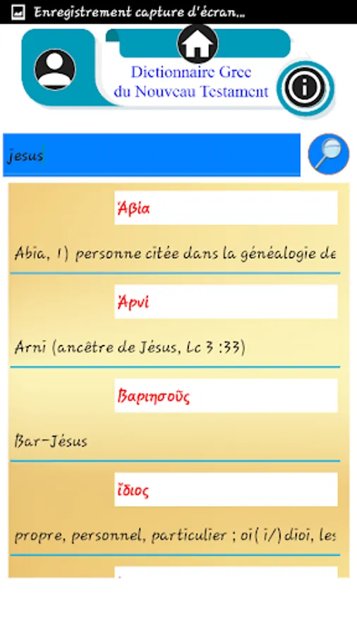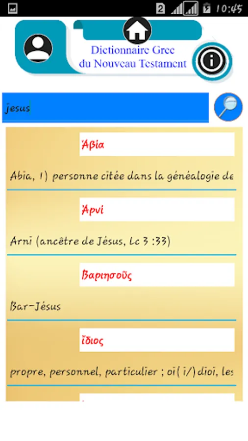 For example, for the term οἶκος, one will find: house, household, family, and not a definition of the type: building constructed to serve as dwelling to the man (Lexis), or as in Louw-Nida: a building consisting of one or more rooms and a dwelling place. The order of the glosses means to indicate, without being absolutely normative, the meaning of a term from its most central use to its most particular (or most classical) use. Although theological considerations are, in principle, absolutely excluded, certain meanings necessarily go beyond the purely linguistic framework. For the writers of the New Testament have appropriated the Greek language, and, without making it a theological language as was formerly thought, have modeled it, personalized it, extended it. Thus, the context can print a word with a new meaning, for example through the play of metaphor. As an illustration, the term σκεῦος means above all object, and more precisely: any object of equipment. But it is quite possible that the Apostle Paul thus designates the human body (in fact the object, the instrument that is most directly accessible to us) which goes beyond the purely semantic framework, or the woman, even the male member. which, therefore, comes from theological exegesis. There are therefore glosses that define the meaning of a word according to the meaning it takes in certain contexts of the New Testament (metaphor, extension, necessary supposition, etc.). As far as possible, we have pointed out the uncertainties or suppositions, either by multiplying the glosses, or by resorting to Hebrew equivalence, or by the use of p.e. (perhaps). It goes without saying that the Greek-French New Testament Dictionary is only the starting point for a study of words, and can not be a substitute for reference works, some of which are listed below. . For an optimal display, the words have been entered in Unicode, but for convenience, we also indicate the form "betacode" of each term to facilitate searches. This Dictionary is gradually enriched: eventually it will include the "Strong numbers", well known to biblical, and a mention of the terms hapax (†).