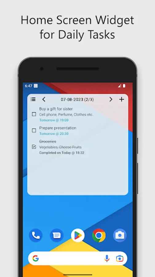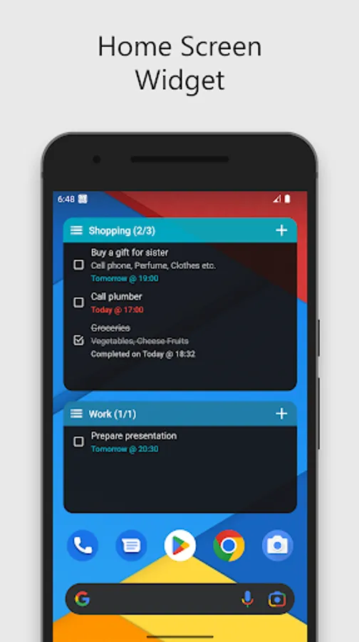 • Smart home screen widget shows instantly what to do, List resizable widget displays upcoming tasks.
