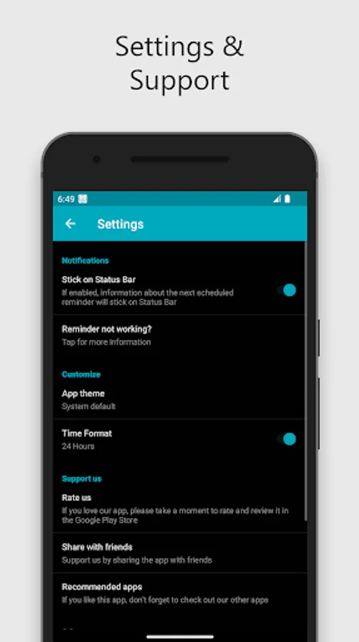 • Information about the next scheduled reminder will stick on Status Bar, you can disable it from settings screen.