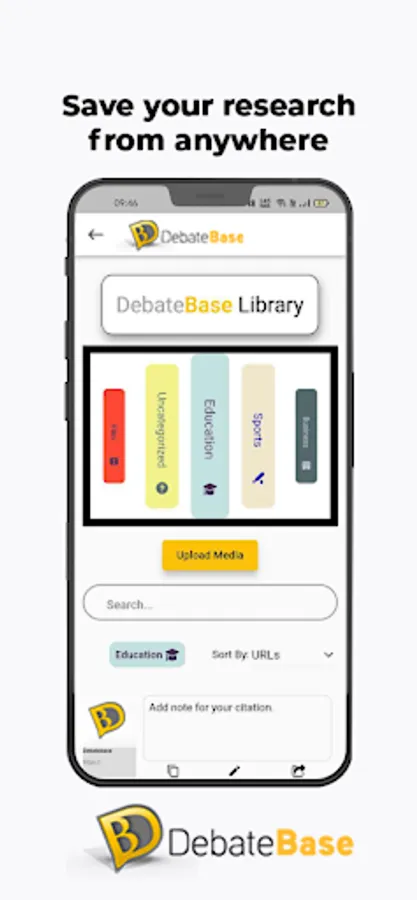 The DebateBase Library is your base for debate operations. Categorize and save links, documents, photos, and videos as references in your DebateBase library. Engage in debates with confidence by having all your supporting references ready to go. Collect and categorize your research and link it directly as citations in a debate. Use these references to improve your debate footing, share with collaborators through the ultra-private DebateBase Chat, help out an active debate by tagging your reference to someone else’s argument, or elevate the discussions on other social networks by sharing your research.