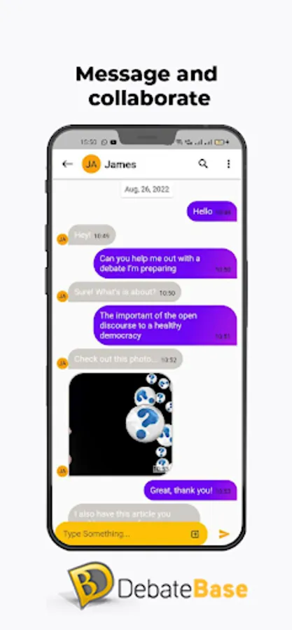 DebateChat leverages powerful End-to-End encryption so no one can read your messages or see what you send, giving you the peace of mind that your personal messages are outside the prying eyes of everyone, even us! Use the DebateChat to collaborate with others on a debate topic, exchange ideas and resources, and prepare for the live Debate experience.