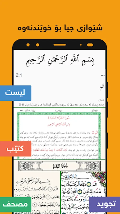 • چوار شێوازی نیشاندانی ئایەت (لیست/كتێب/مصحف/مصحف لەگەڵ تجوید)