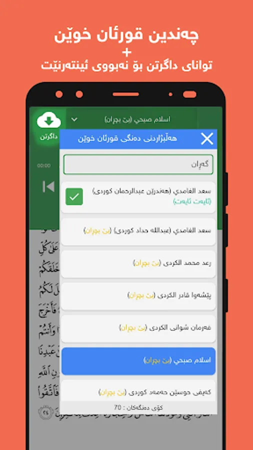 • كاركردن بەبێ ئینتەرنێت (تەنها یەكجار پێویست ئەكات دەنگی قورئانخوێنەكان داگریت)