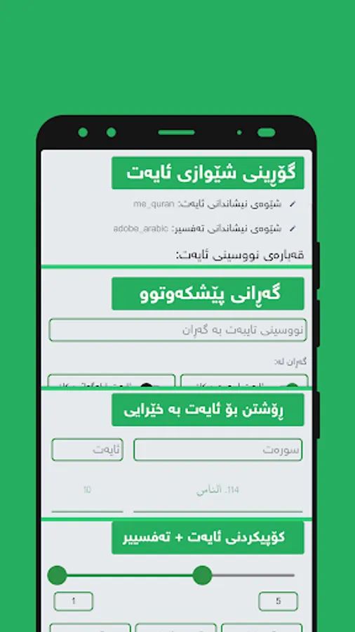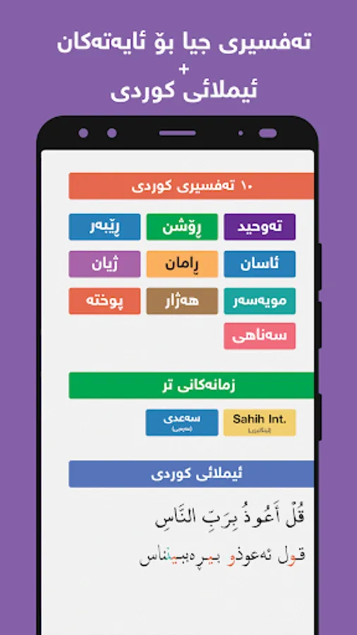 • گەڕانی پێشكەوتوو (دەتوانیت لە ئایەتەكان، تەفسیرەكان یاخود سەرنجەكانی خۆت بگەڕێیت بەدوای ئایەتدا).