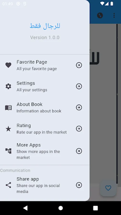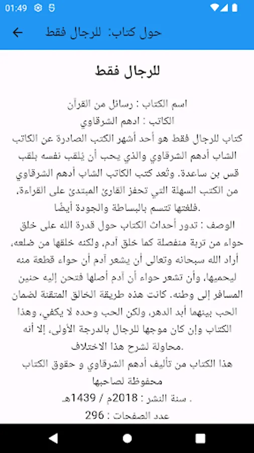 An application for a book for men only, which has high-quality features such as saving one or more pages, sharing a page or storing it on the phone, taking into account the marking of the last page you read so that it appears first next time