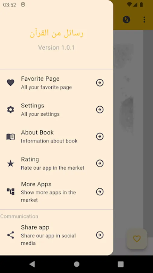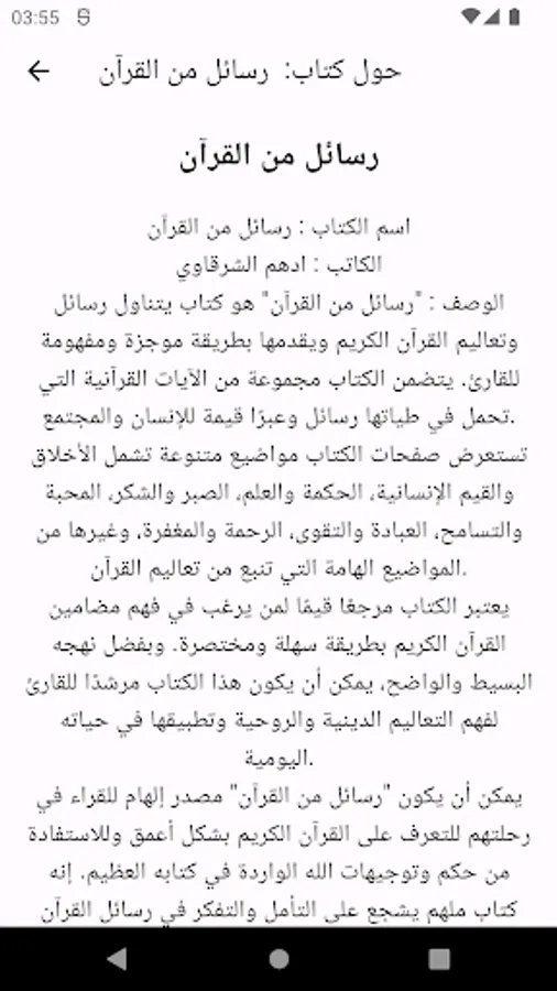 An application for a book of messages from the Qur’an, which has high-quality features such as memorizing one or more pages, sharing a page or storing it on the phone, taking into account the marking of the last page you read so that it appears first next time