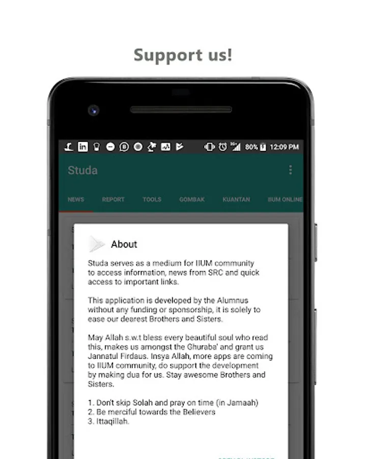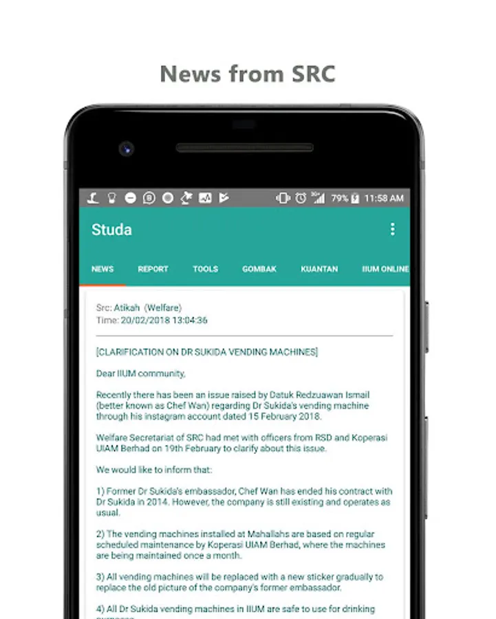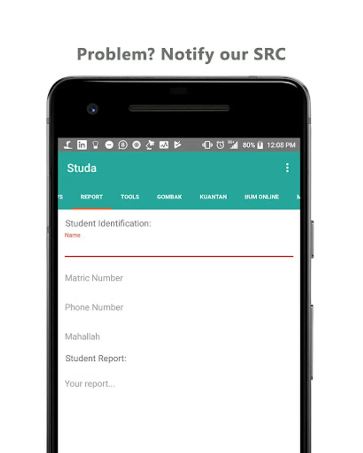 Studa serves as a medium for IIUM community to file a report, access information, news from SRC and quick access to important links and contacts.