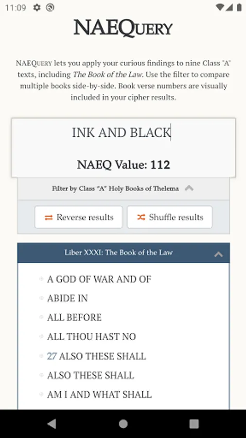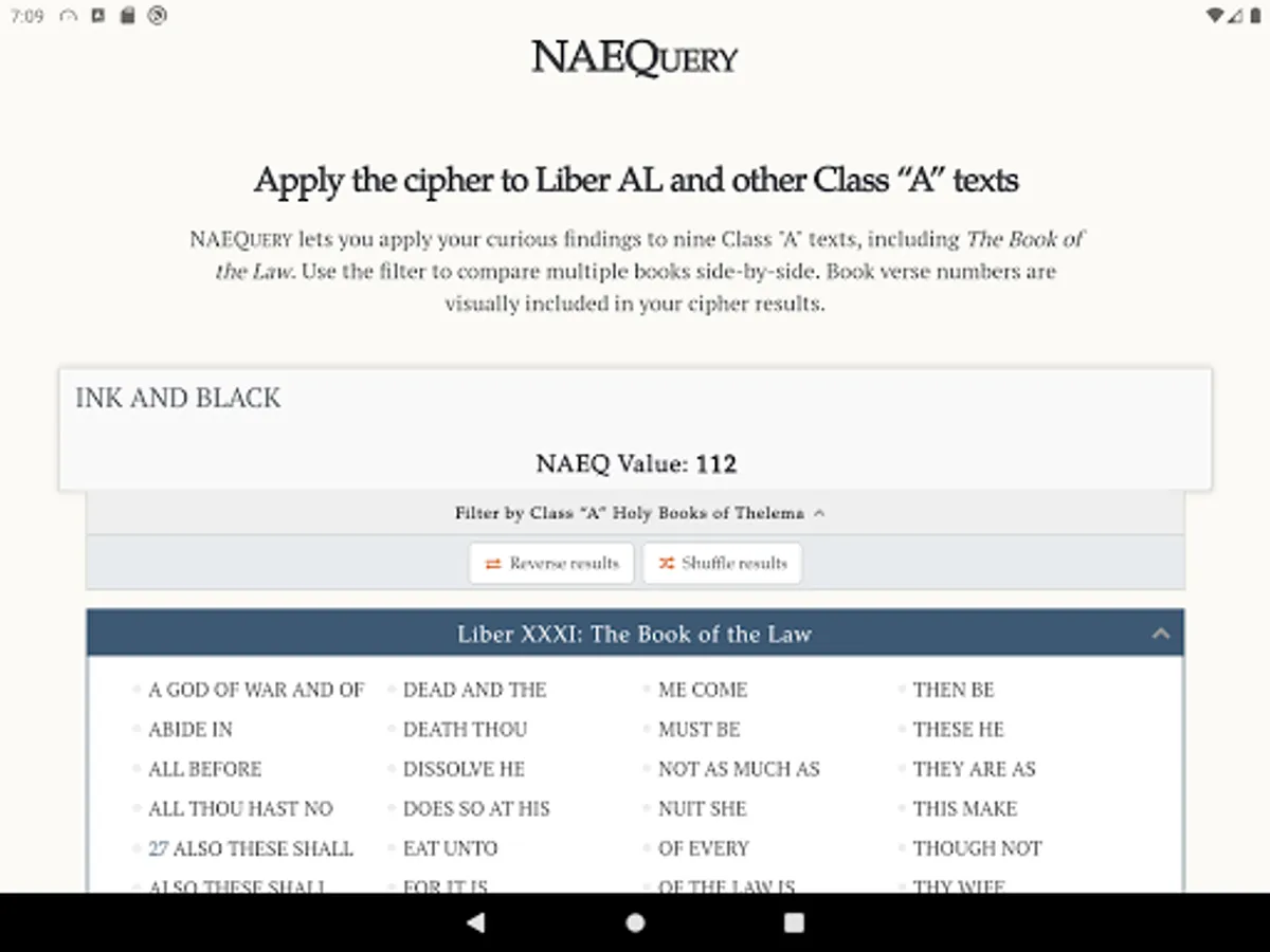 NAEQuery lets you apply your curious findings to nine Class "A" texts, including The Book of the Law. Use the filter to compare multiple books side-by-side. Book verse numbers are visually included in your cipher results.