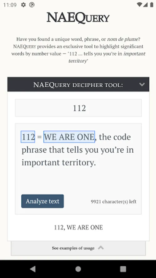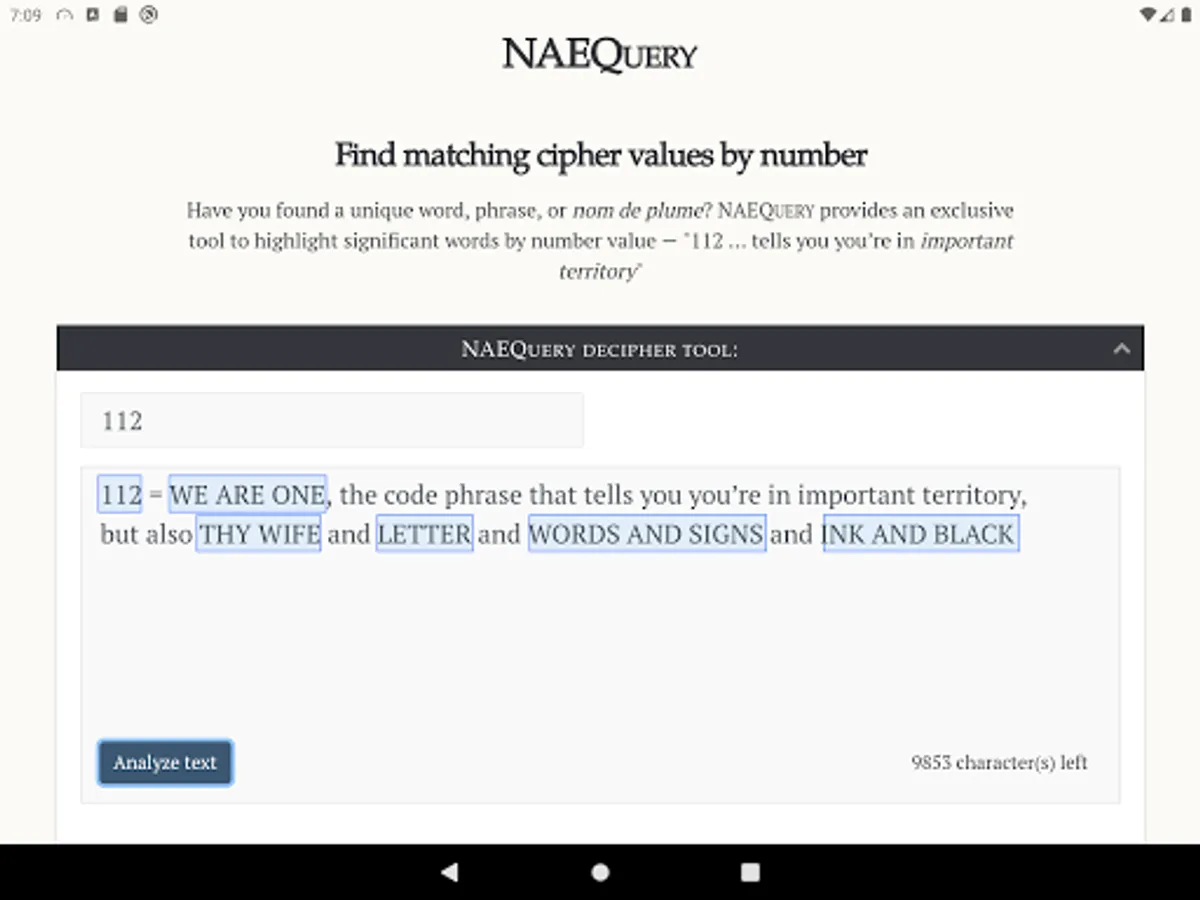 Have you found a unique word, phrase, or nom de plume? NAEQuery provides an exclusive tool to highlight significant words by number value ― 112 … tells you you’re in important territory.