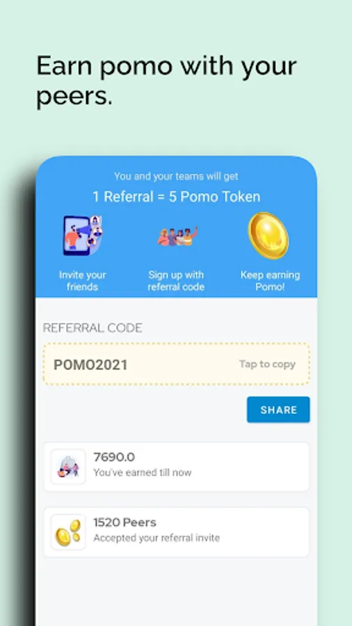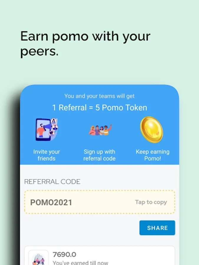 You can invite your friends to earn more POMO! You and your teams will get 10 POMO token for one referral.