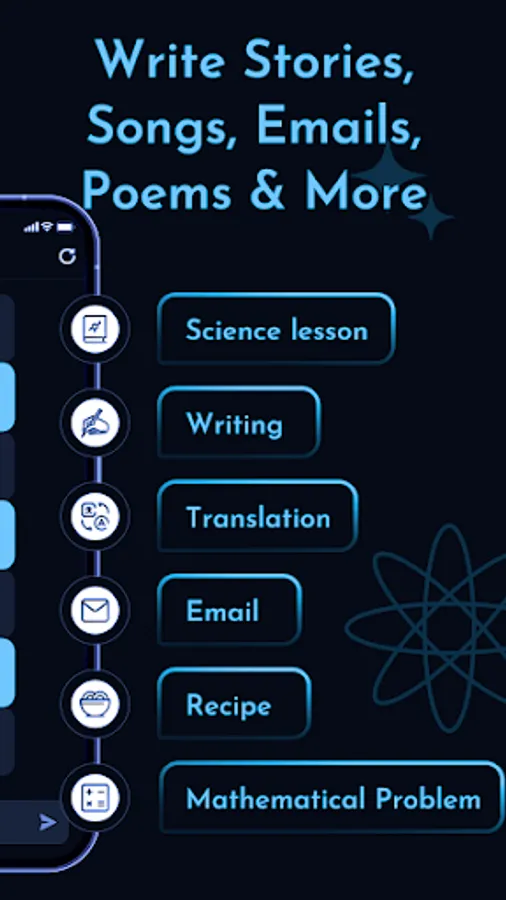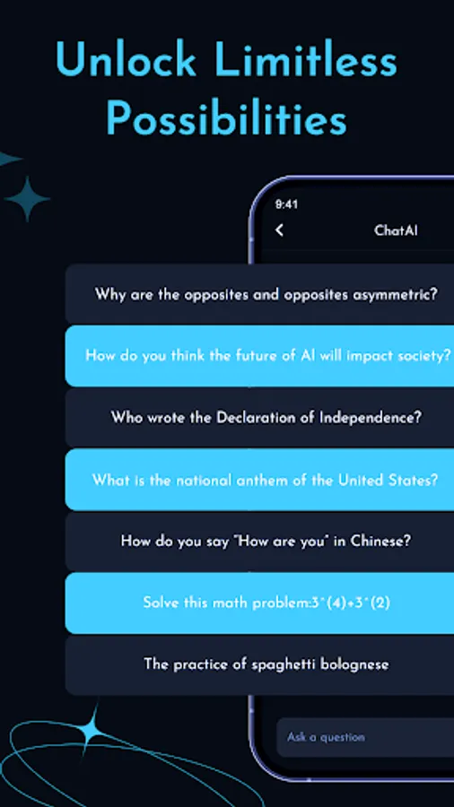 With AI Chat, you have access to personalized assistance for all types of writing projects, whether it is essays, compositions, social media posts, or poems. Basically, the app can assist with any task, such as crafting a unique and unforgettable pickup line or even creating an original song. That's right! This AI helper is not only smart but also creative. Let your imagination run free with it!