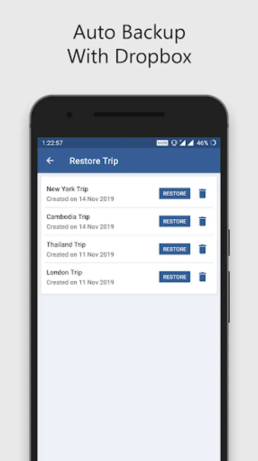 • Auto Backup option using Dropbox, you can manually restore trips with Dropbox login.