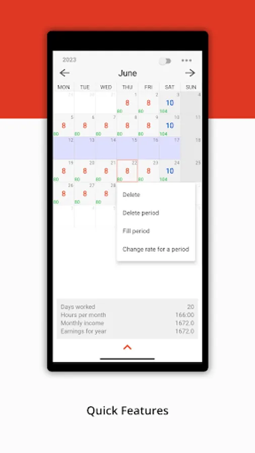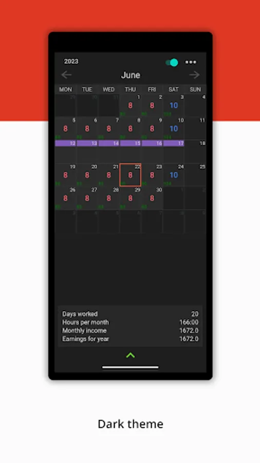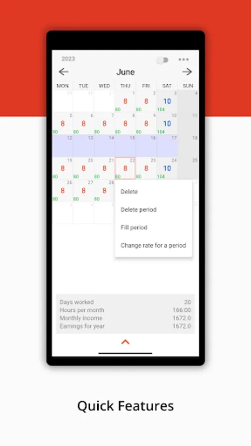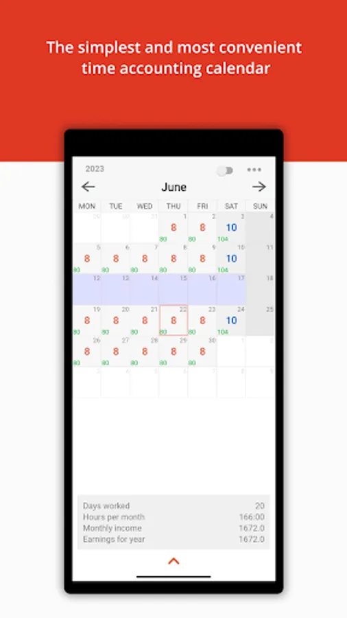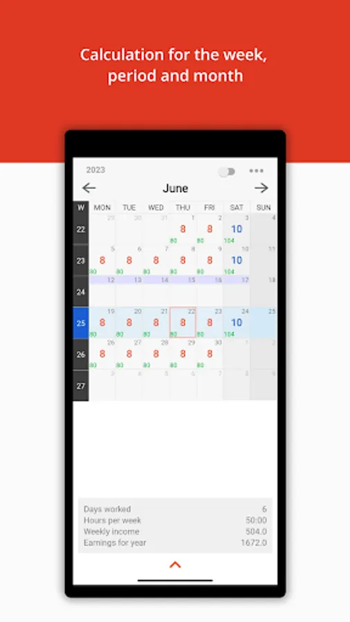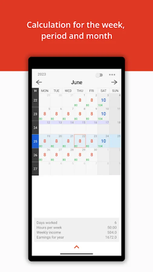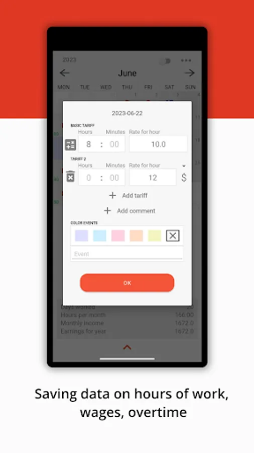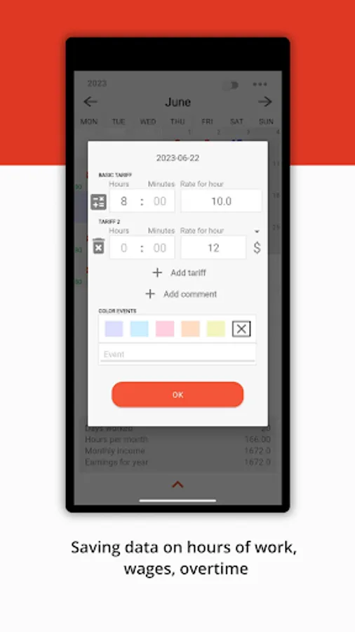 - Saving data on hours of work, wages, overtime, notes for every day.