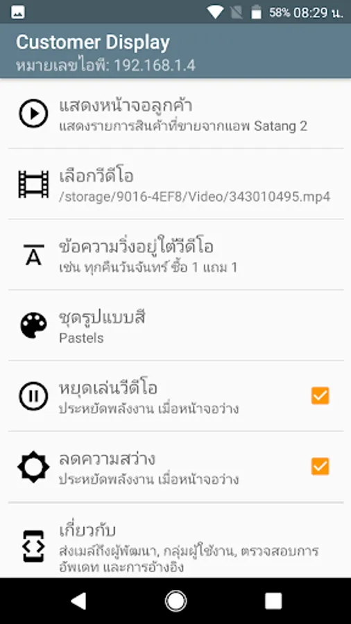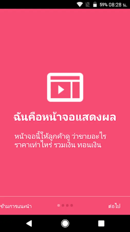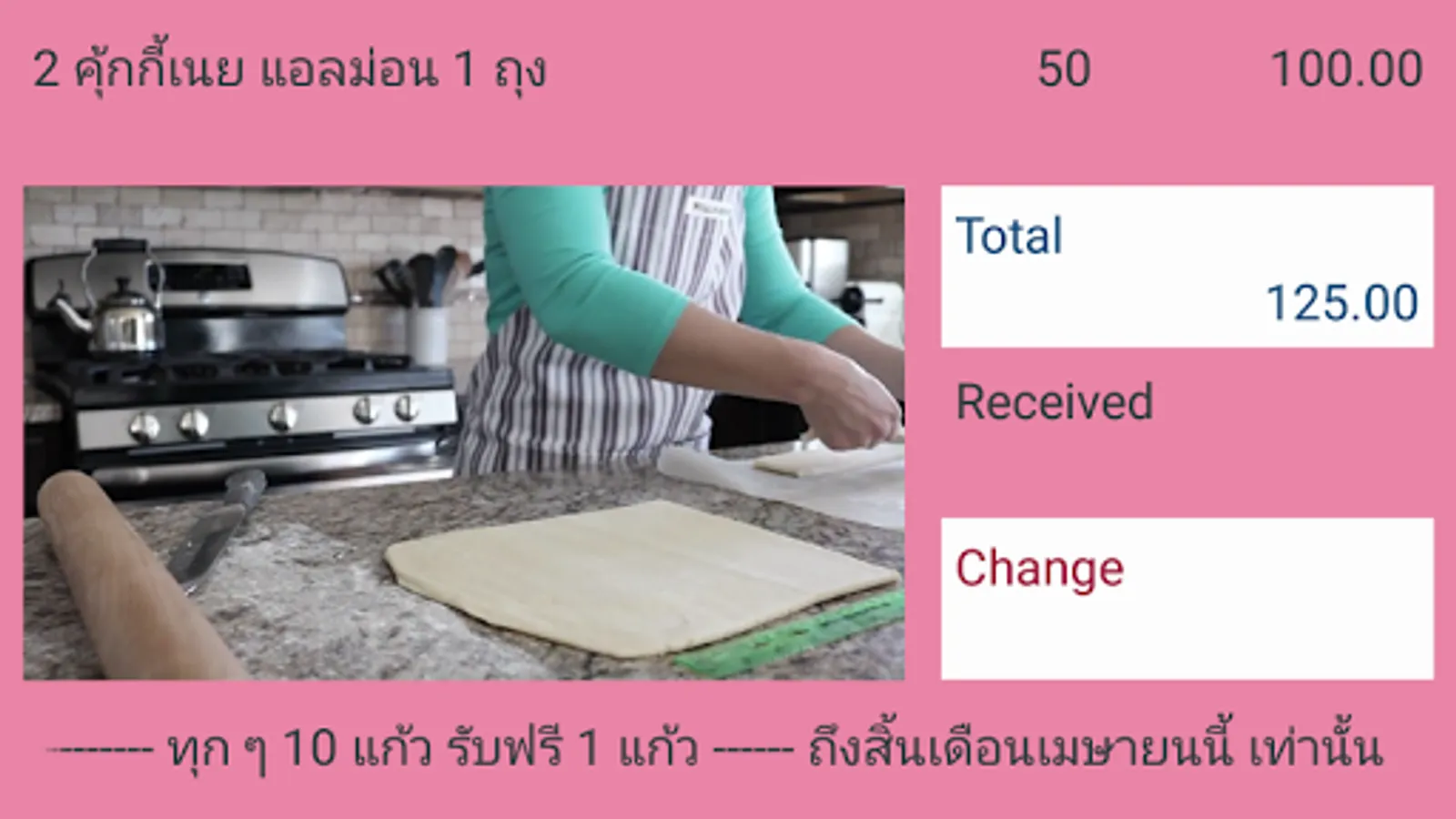 The display screen is a client application that links to apps through Wifi Satang2 listed by product, price, quantity, total amount. Including cash received and the change to the customer and a video player as well as a list.
