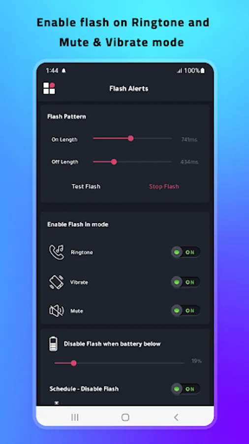 • You can set a time period to turn off the flash alerts. You can turn off led flash alerts on call and sms during the sleep period through the flash alert on call app.