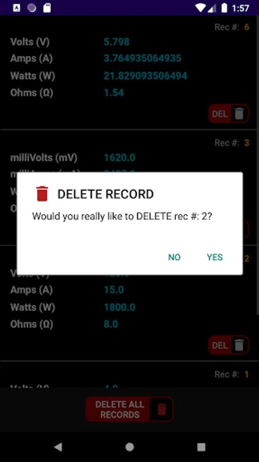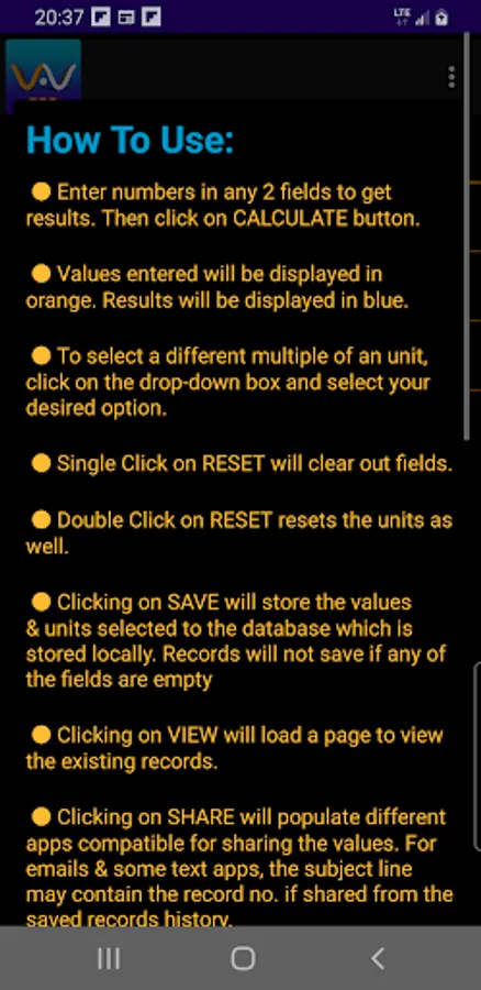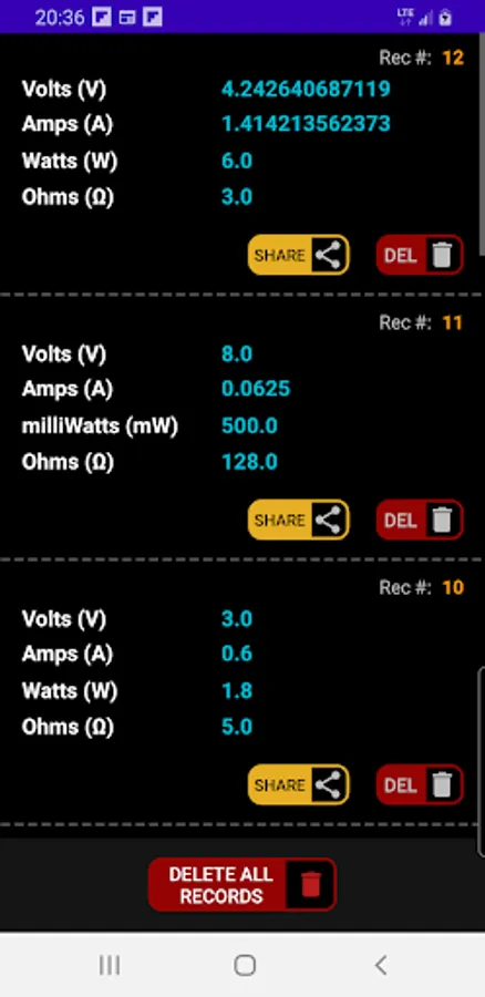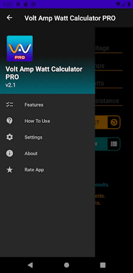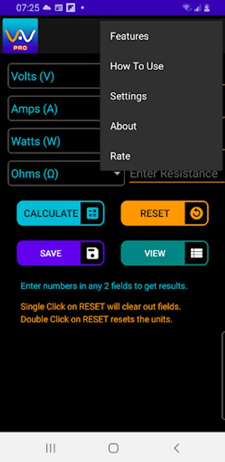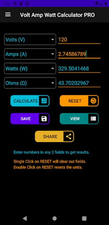 An app that calculates volts, amps (current), watts (power), & ohms (resistance) by entering only 2 values. Also known as Ohm's Law.