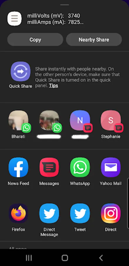 5. Have the ability to share your results to different apps like text messenger, WhatsApp, Instagram DM, FB chat messenger, email clients like yahoo, gmail, etc. and many more apps. If the app does not support transfer of values, then simply copy the values by clicking the copy button on top and paste.
