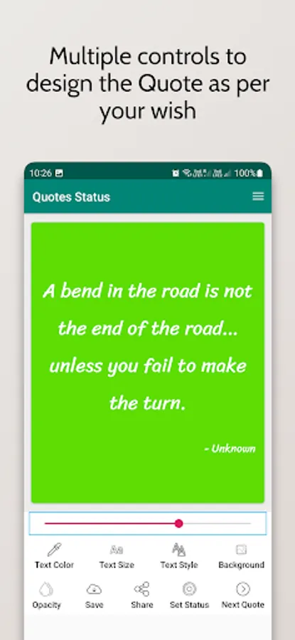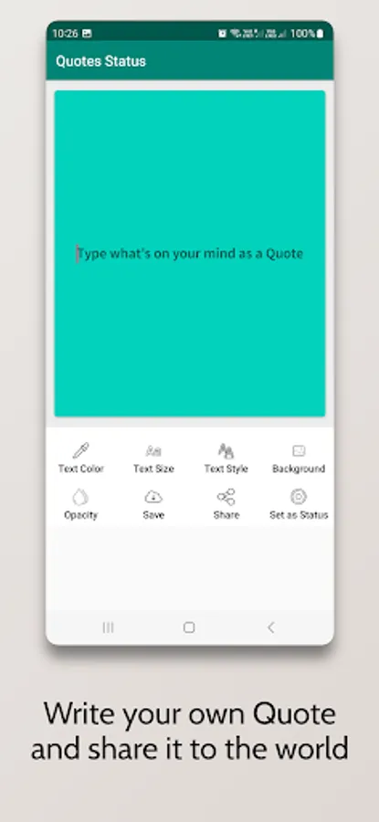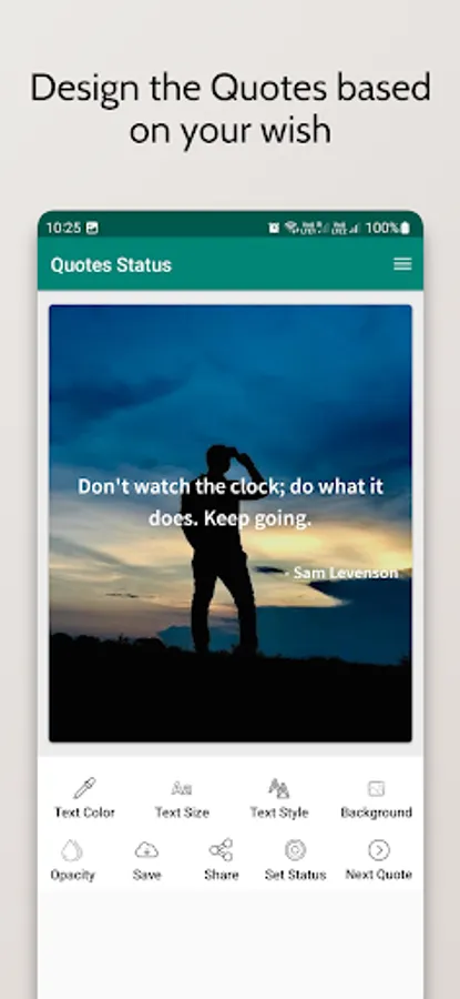 Quotes Status will help you to Create Motivational Quotes from legends and your own Quotes to motivate yourself and others using Quotes status you can share that Quote to others or save it to your device, Quotes Status gives you wonderful options to create and customize beautiful Quotes.