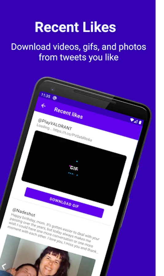 - Recent likes - download videos, gifs, and photos from the most recent tweets that you've liked. No longer do you need to search Twitter just for media from a tweet that you recently liked