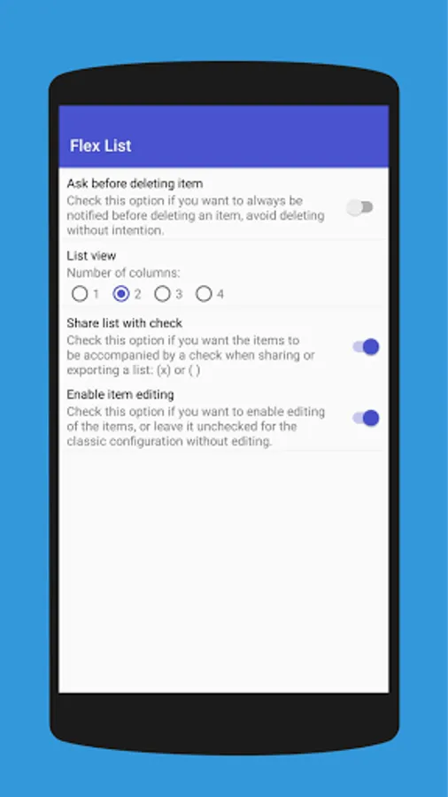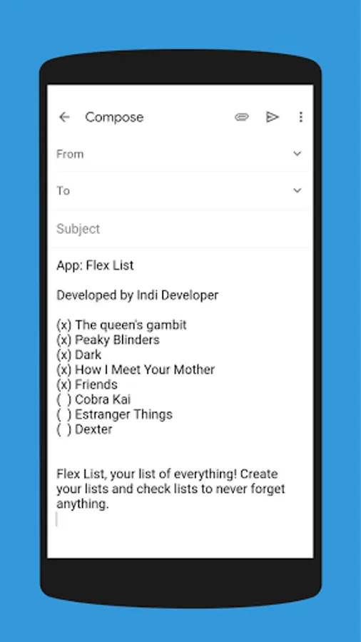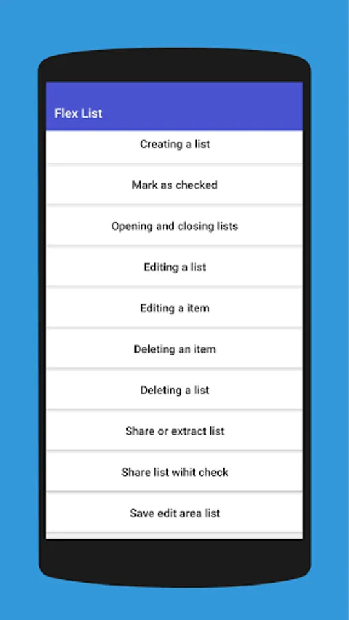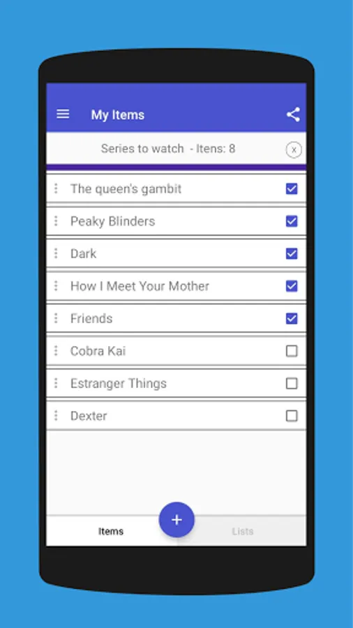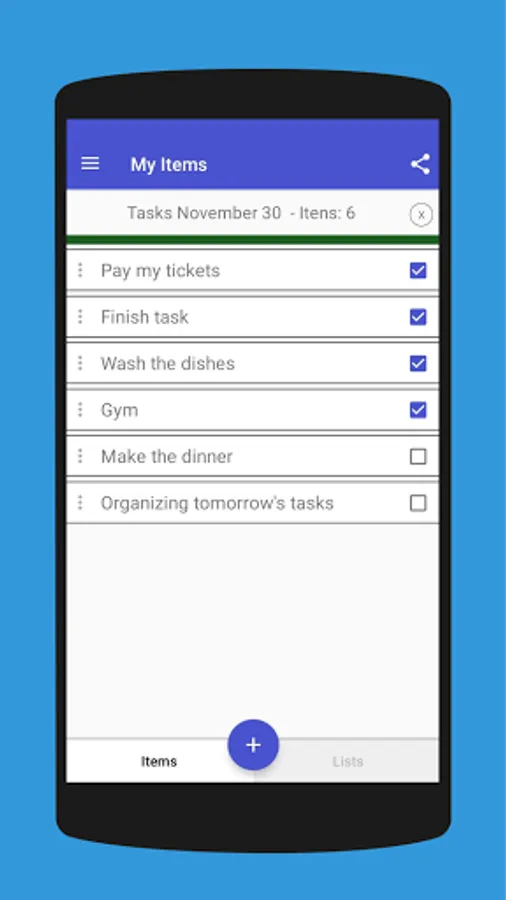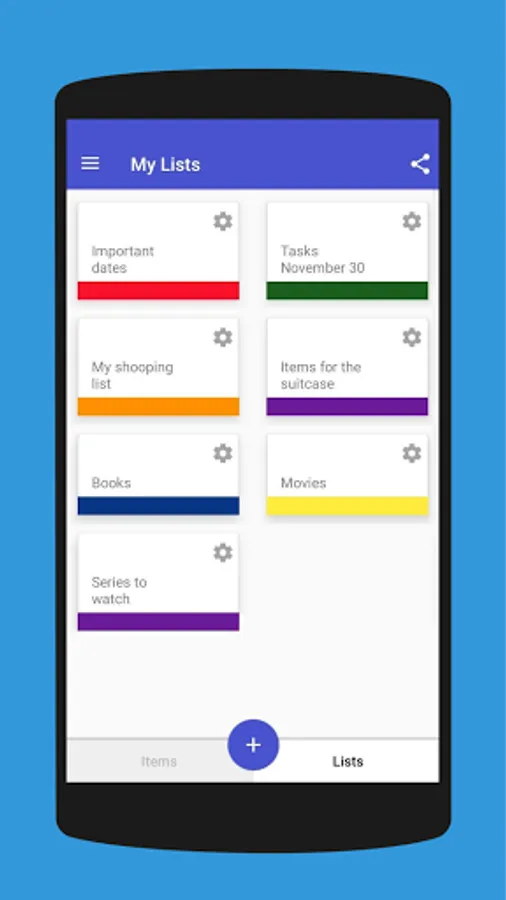 Add things, mark as checked. Create various lists, altern between lists, put a color note by categorie. Share or extract content from your lists. Personalize the exibiton. Make lists in order not to be worried about forgetting something.