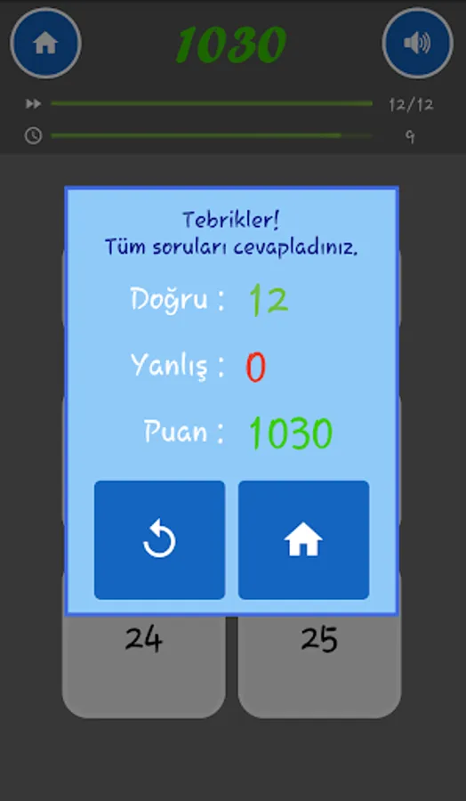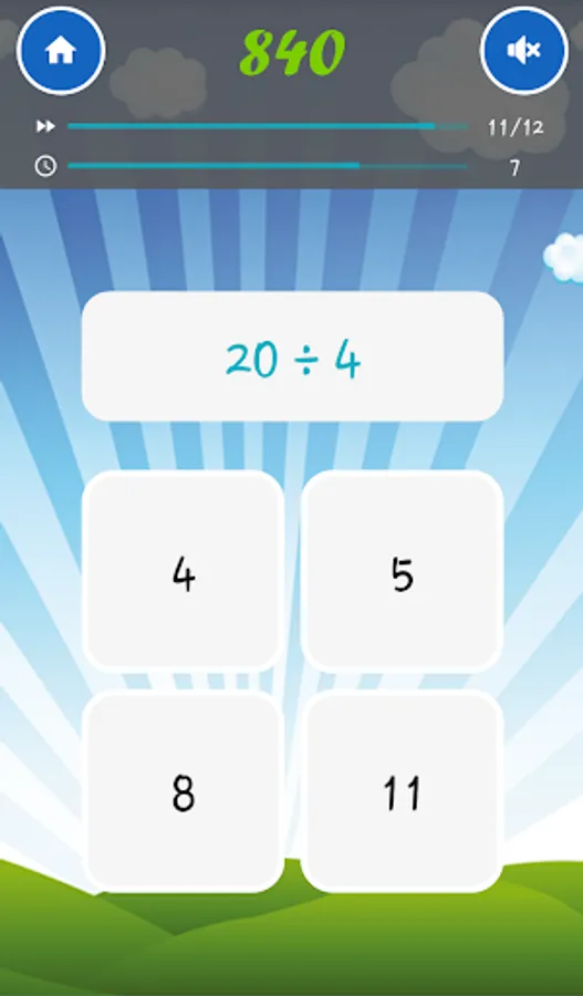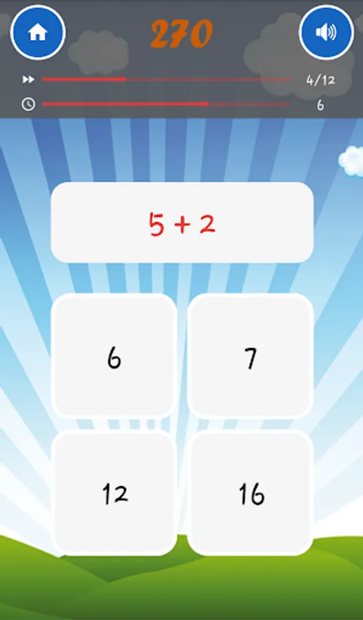 You can answer 12 questions by selecting one of 5 options: Add (+), Subtract (-), Multiply (×), Divide (÷) and Mixed (?).