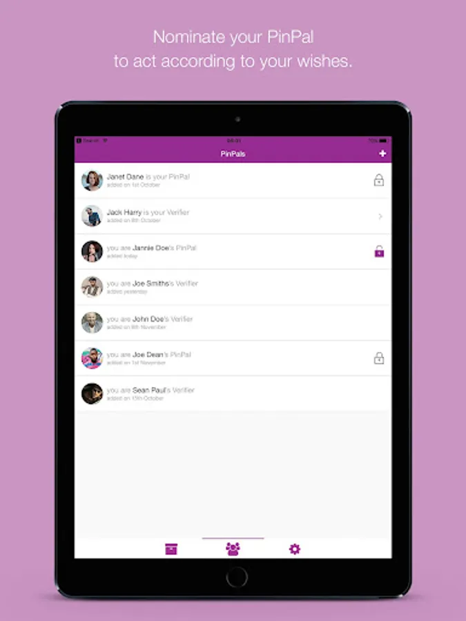 PinPal allows you to pre-arrange for someone to take control of all your digital accounts at the point in the future, when you're no longer around to do so and to deal with them according to your wishes. Store all the information they’ll need in one place and then create your own Digital Will. Your PinPal won’t be able to access any information until your Verifier confirms that this should be granted. You will also have ample opportunity to deny any premature requests for access.