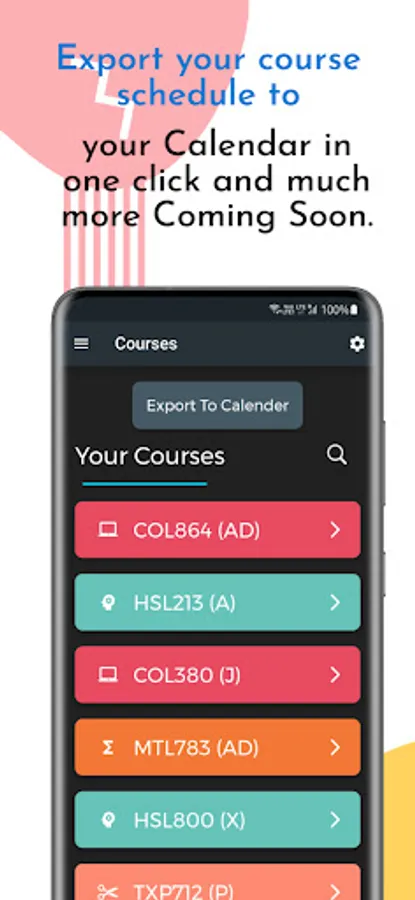 - Courses: Export your course schedule to your calendar in seconds! Get notified before the start of everyone class.