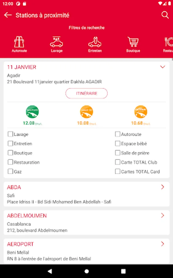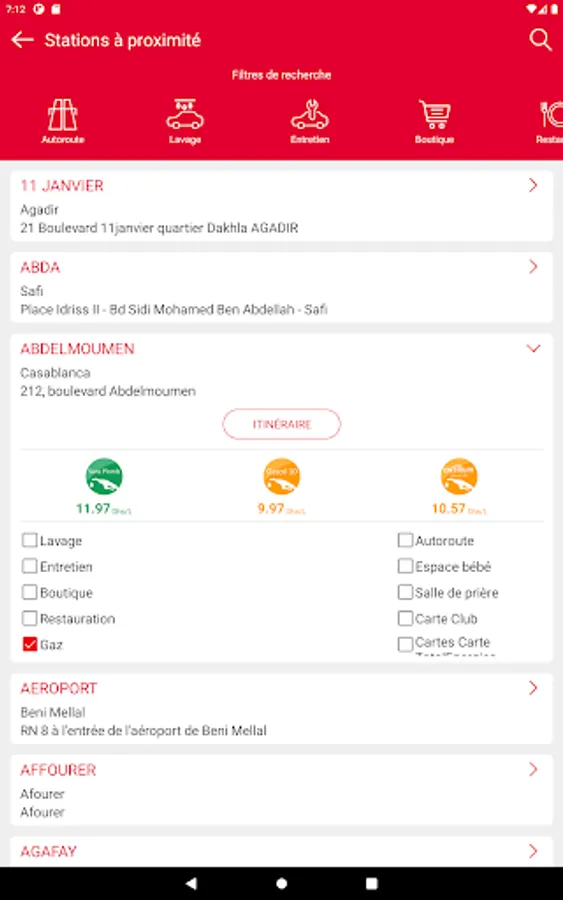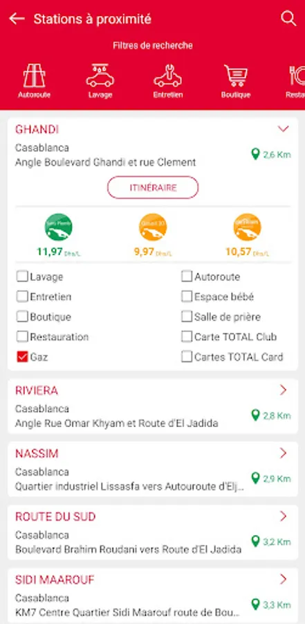 • Find the service stations closest to you with the map, contact details, fuel prices and services offered (washing, maintenance, shop, restaurant, baby area, prayer room, Club Card and ACTYS Card),