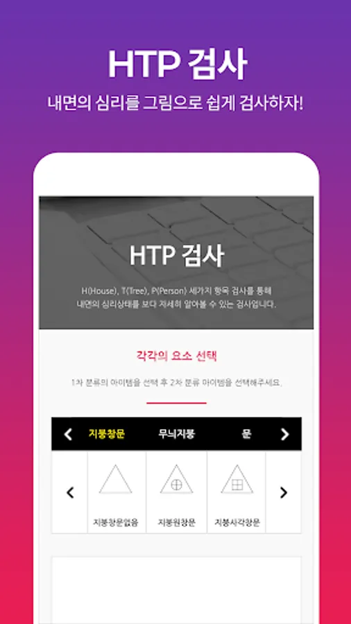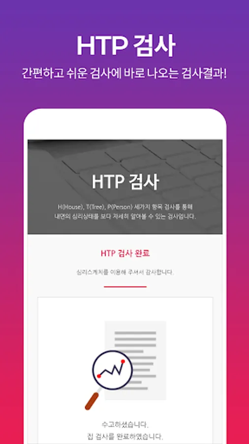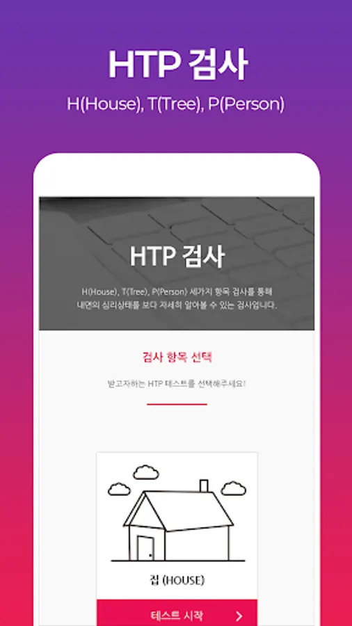 HTP검사는 House(집), Tree(나무), Person(사람)을 그려보게 하는 그림검사입니다. 한 종이에 모두 그려넣는 KHTP검사가 있고 사람그림을 남,녀 양성을 모두 그리게 하는 HTPP검사가 있습니다. HTP 검사는 1920년대에 구디너프(Goodenough, 1926)가 고안한 인물화 검사(Drawing a Person Test, DAP)를 바탕으로, 존 벅(John Buck)이 1948년에 집과 나무를 추가로 그리도록 재개발하였습니다.