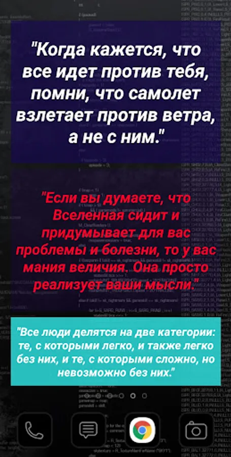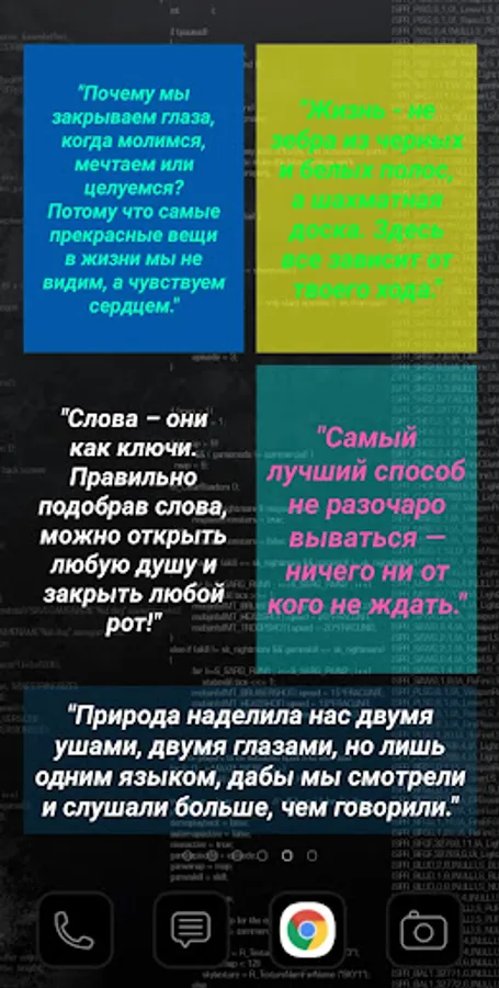 The widget is fully customizable, both color and size. By default, the widget is updated every 30 minutes. It is also updated at any time by clicking on the widget. An Internet connection is required for the widget to work, since the base of quotes and expressions itself is located on a remote server.