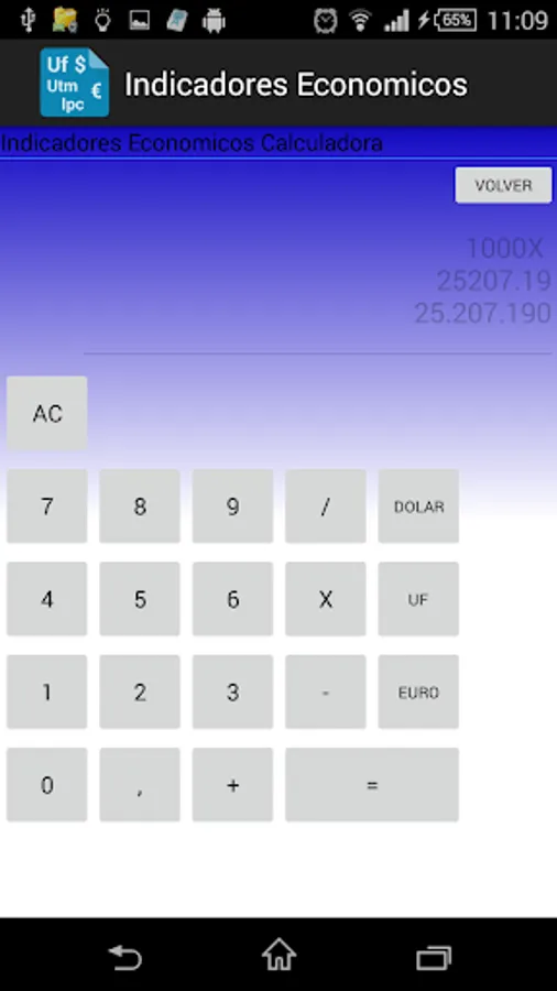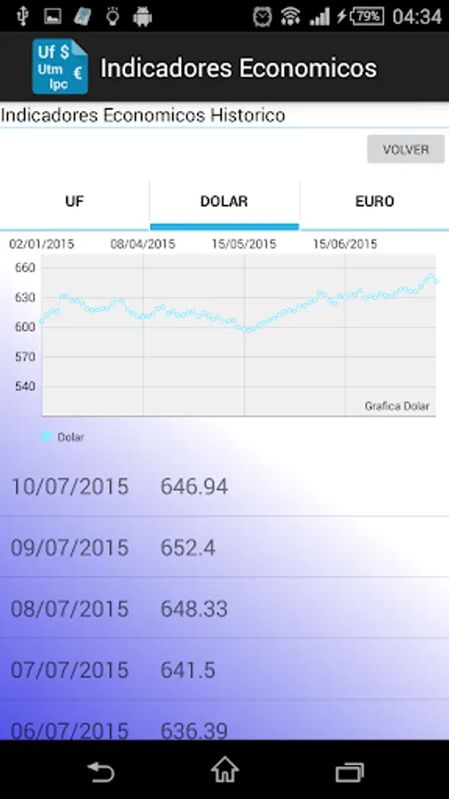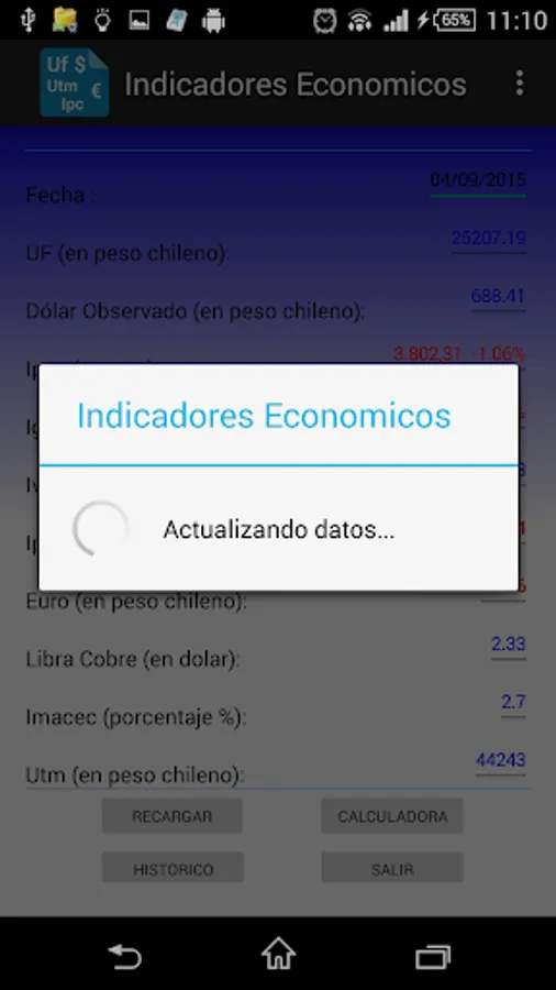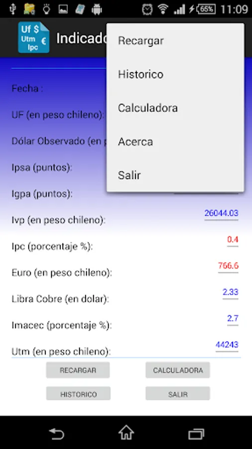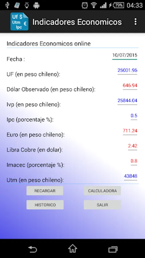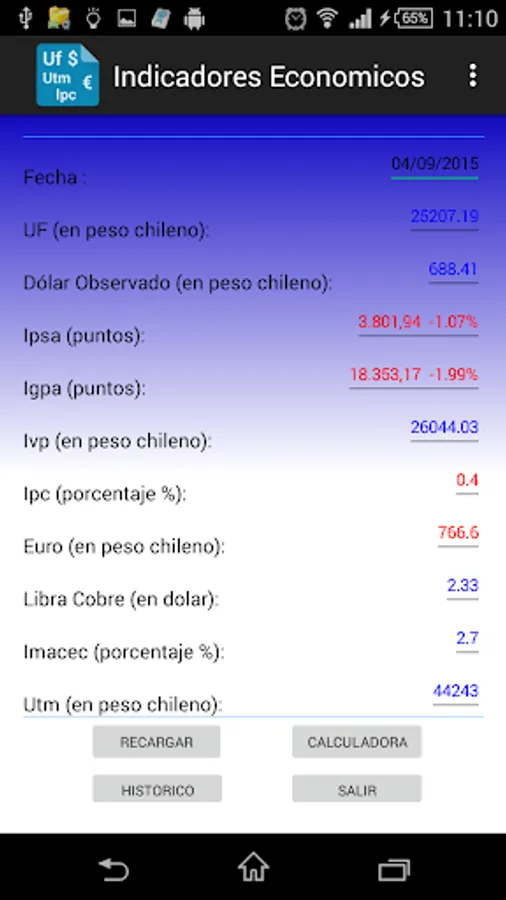 deploys core values and indices of interest, such as Chile UF, UTM, Dollar, Euro, etc.
