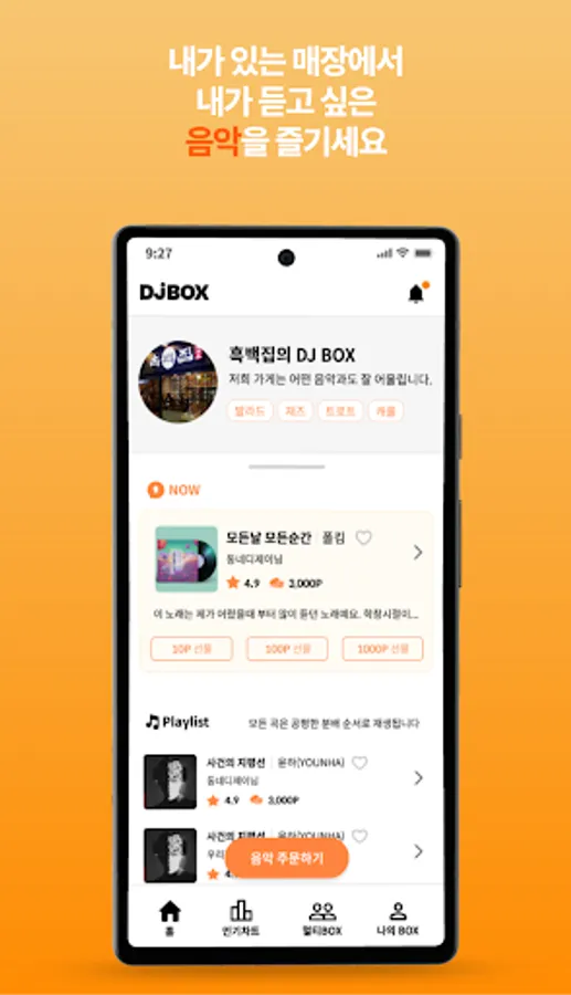 DJBOX is easy to use. Users can open DJBOX on their smartphones, select the music they want and place an order, or store owners can simply press the play button. This is a simple way to change the atmosphere of your store at once.
