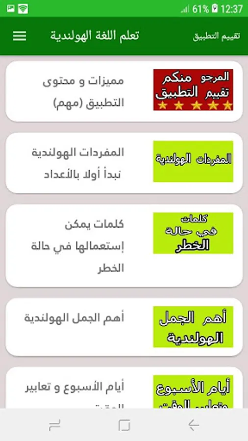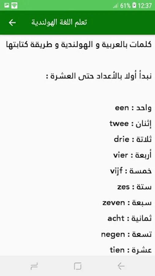 The application to learn the Dutch language was prepared by experts specialized in learning the Dutch language for beginners and it is characterized by many possibilities as it contains tests to develop mental abilities that includes days of the week, months of the year, names of fruits and vegetables, as well as numbers with letters and all of that in an atmosphere full of fun and Longing.