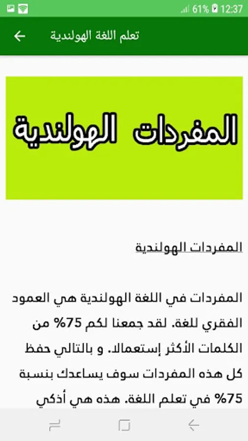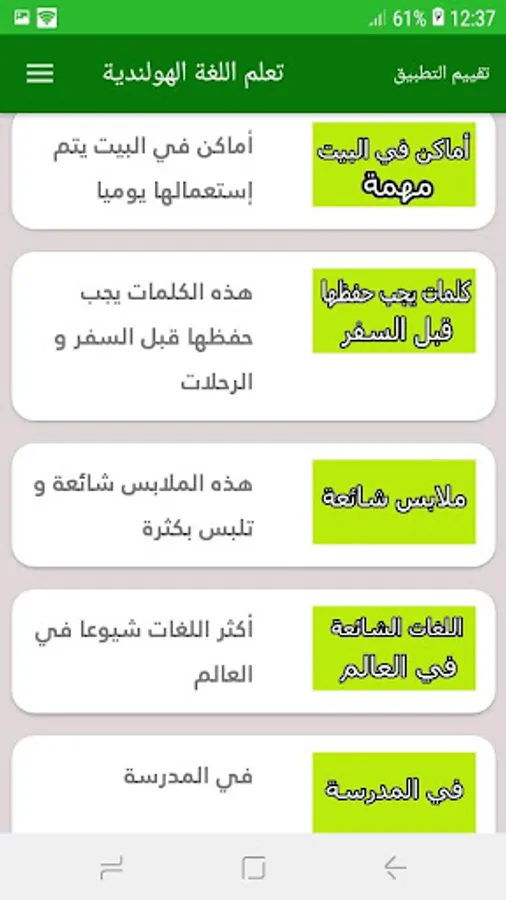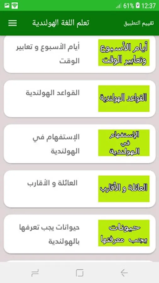Learn the Dutch language is a comprehensive application and came to solve all problems and inquiries, so our application is suitable for all ages; If you are a student going to pass the Dutch language tests at school or university, or you are about to pass the job acceptance tests or want to master the Dutch language because you are about to travel outside the country to continue your university studies or to spend your vacation.