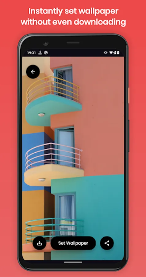 You can view any wallpaper beforehand to see how it will look on your phone's screen. You can set it instantly without even downloading. Yeah, but that doesn't mean you cannot download it - You can also download your wallpaper of choice as and when you want. You can also share any wallpaper via social media to your friends and mates.