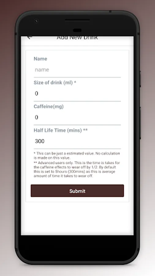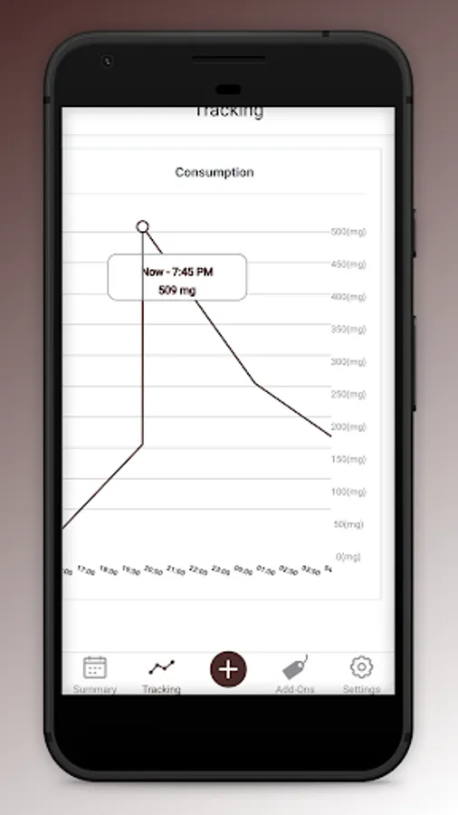 - View a graph to understands caffeine values (mg) over time including custom half life values.