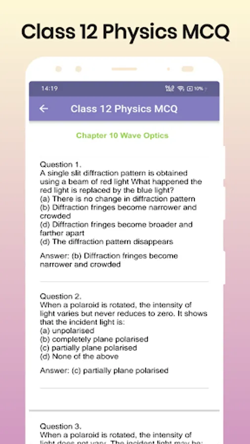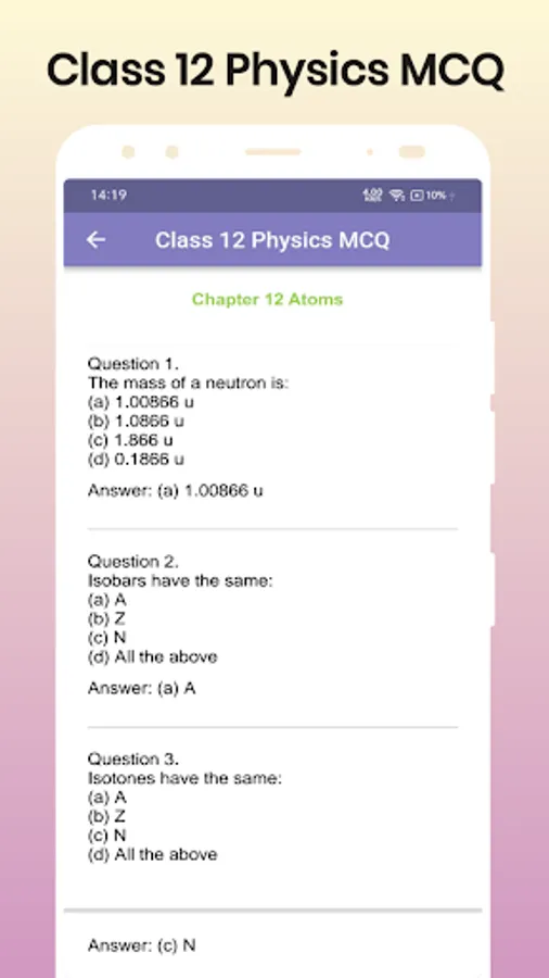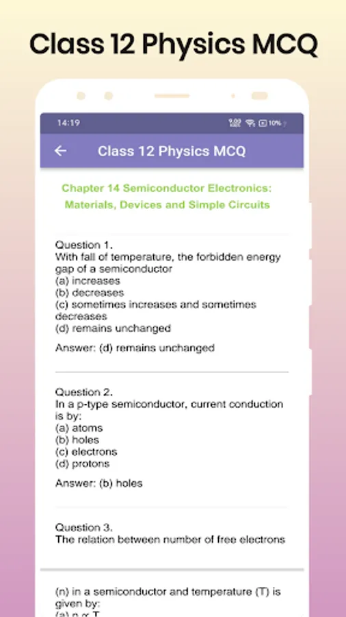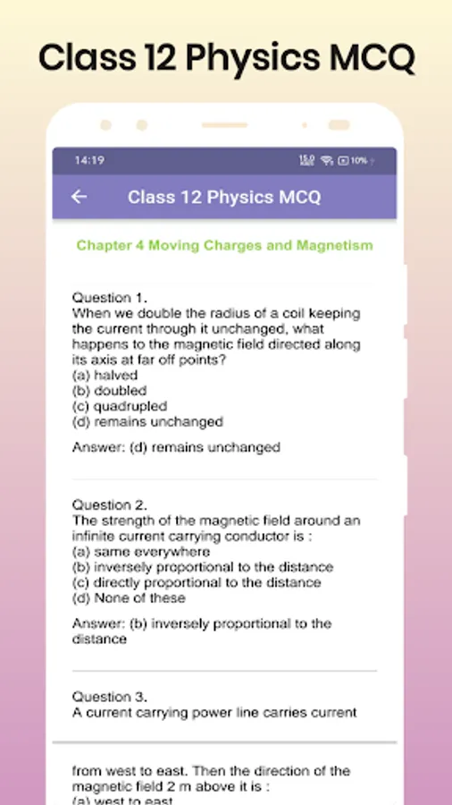 This app contains solution of all the chapters included in Class 12 Physics NCERT Books MCQ for board exam.