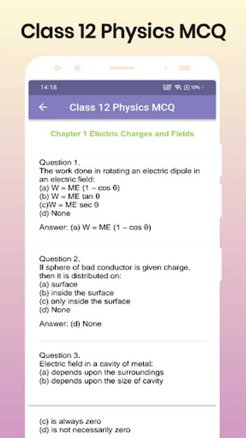 This app contains solution of class 12 physics MCQ in most systematically way. It will help in quick revision if you liked our app. Please rate us.