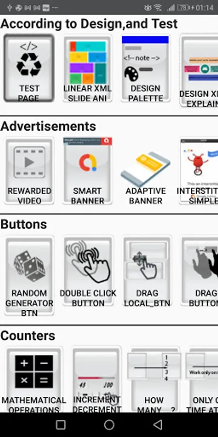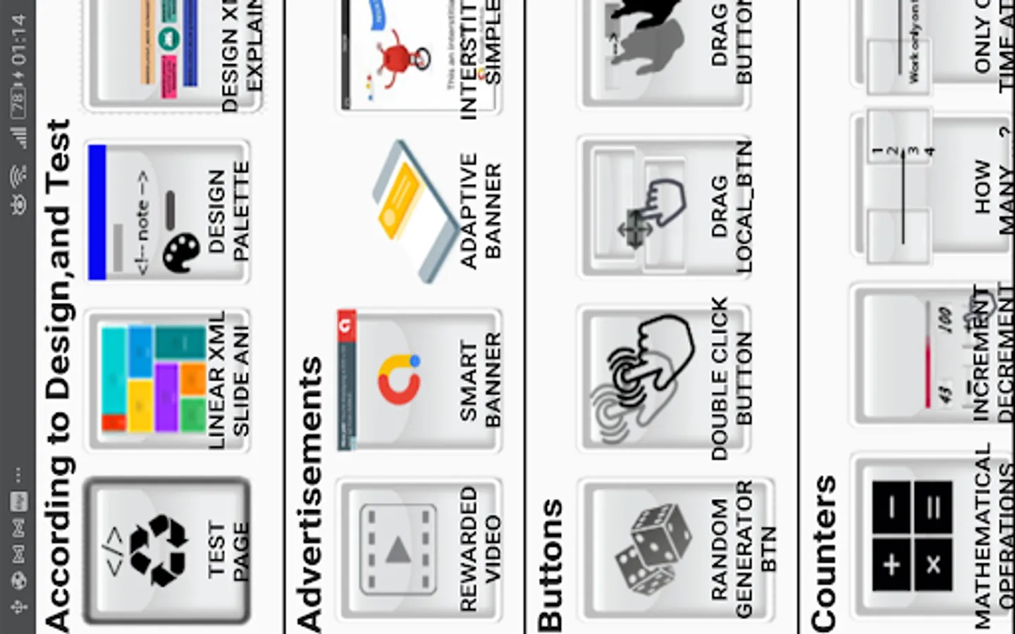 interstitial simple, smart banner, rewarded video ,percent bar ,progress bar ,transparent activity ,contact page, dialog question ,video view,