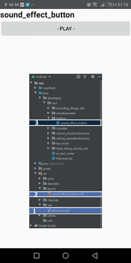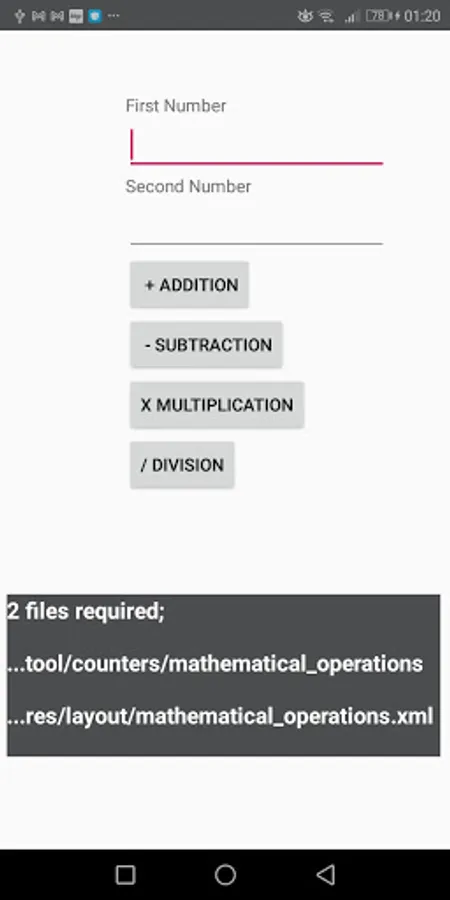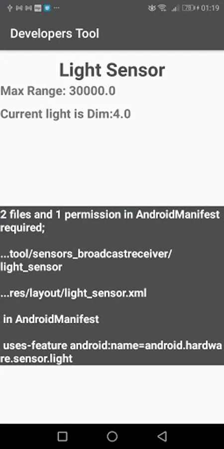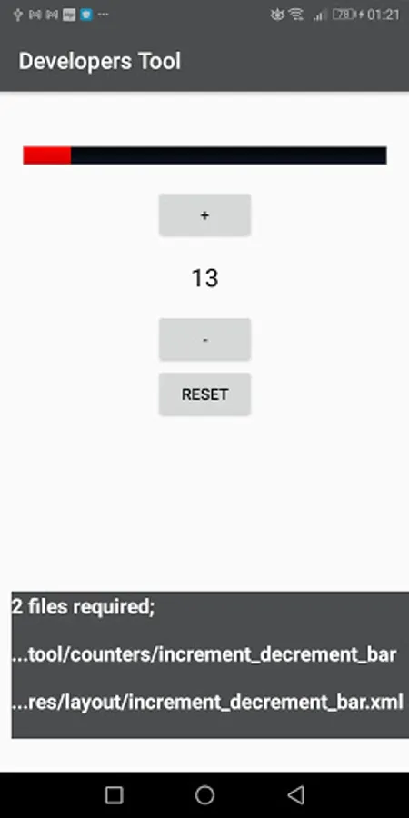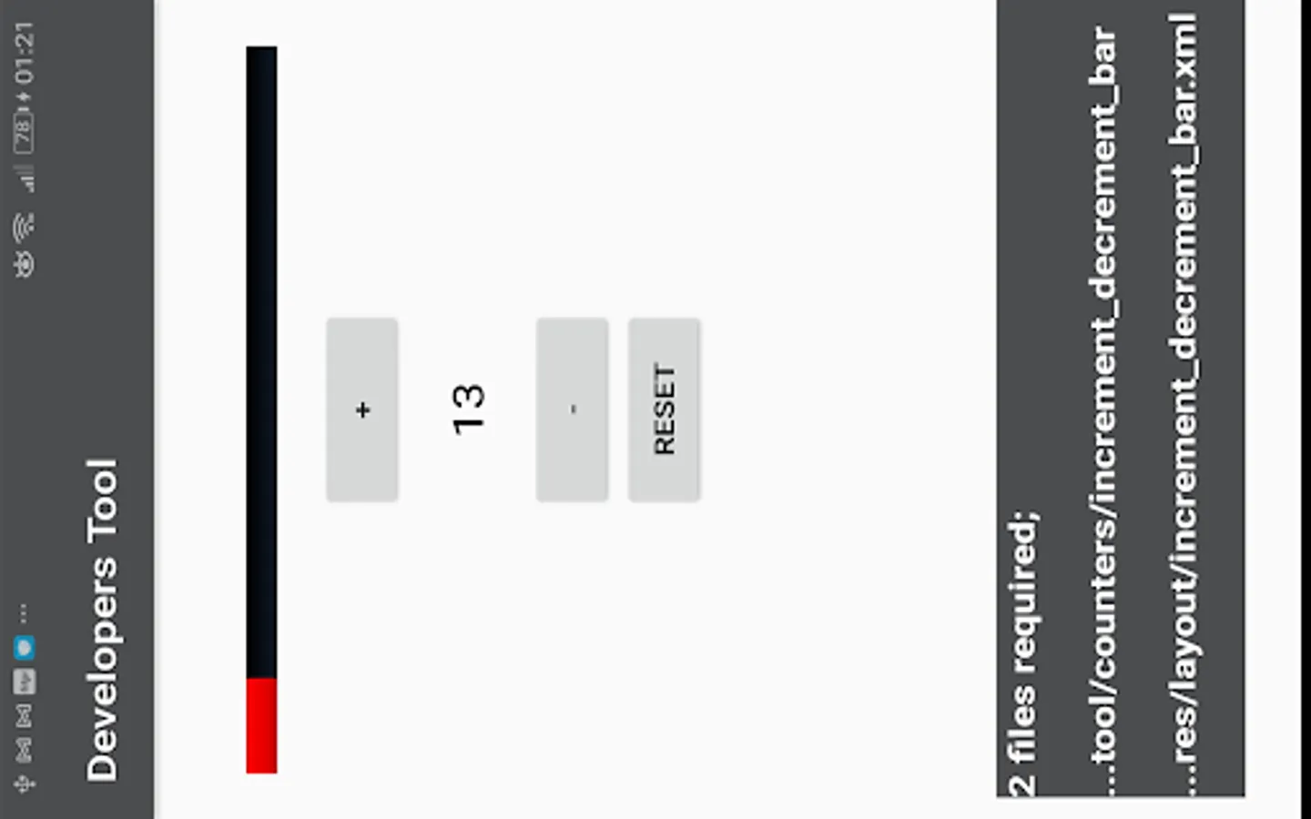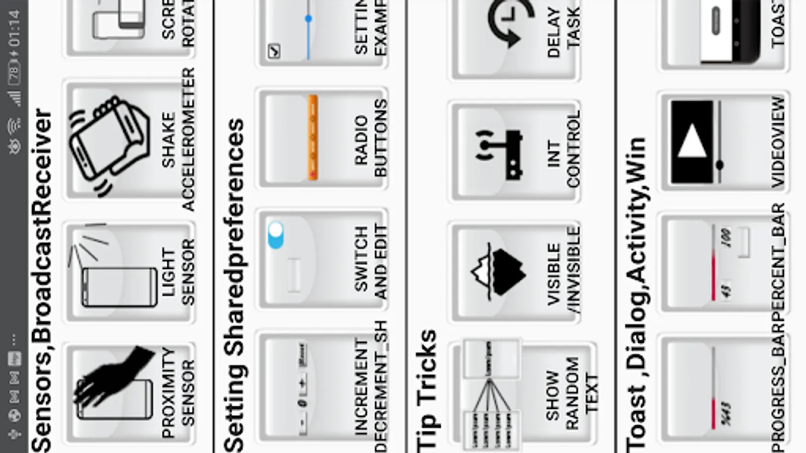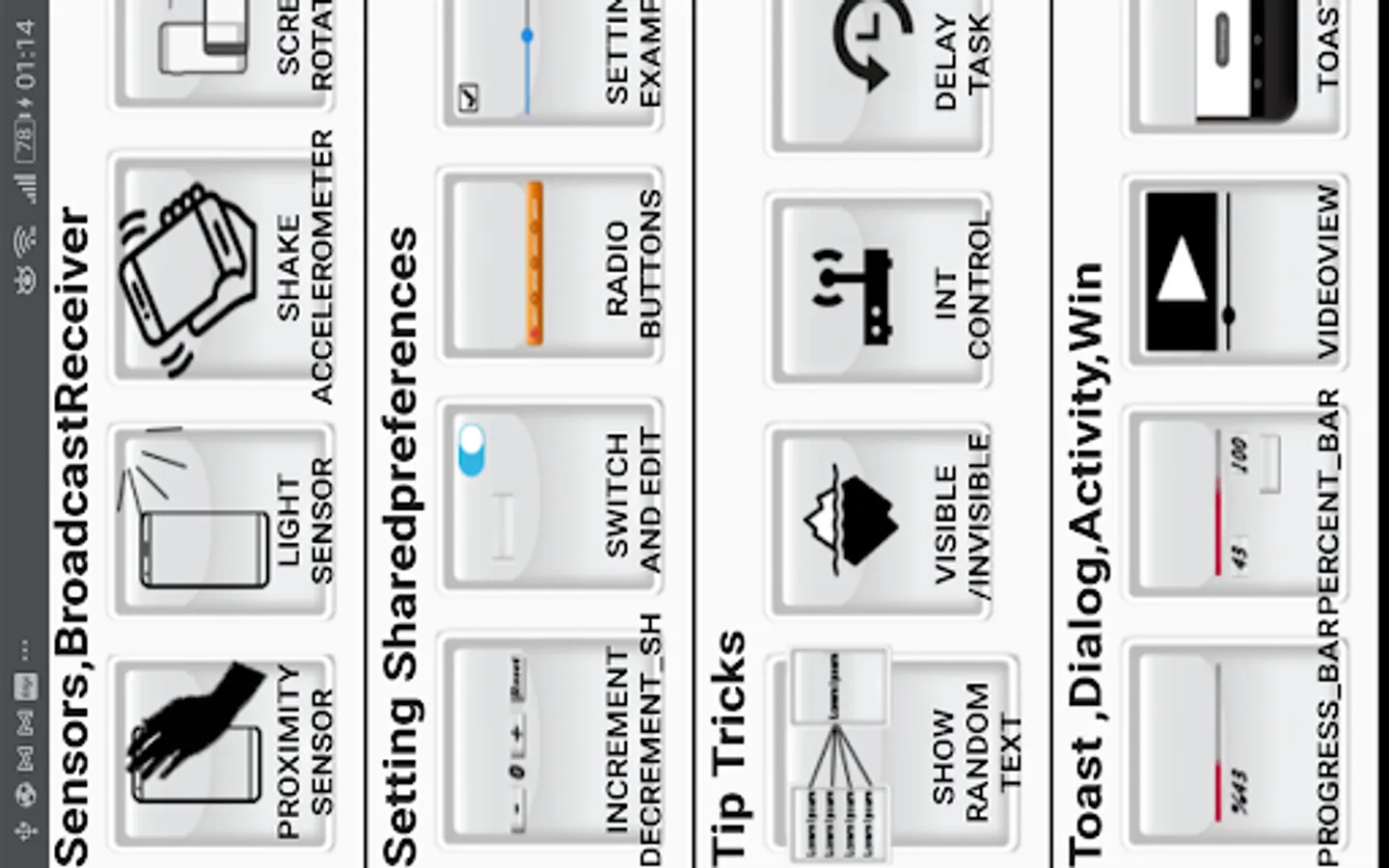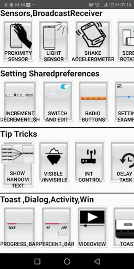 ,sound effect ,share app link buttons.Counters ; increment decrement bar ,task by click number,mathematical operations... and Sensors Broadcastreceiver ;