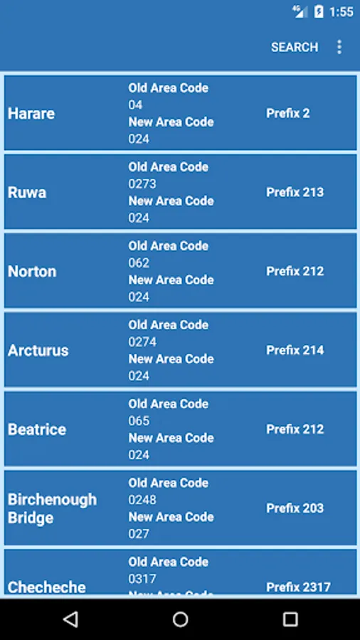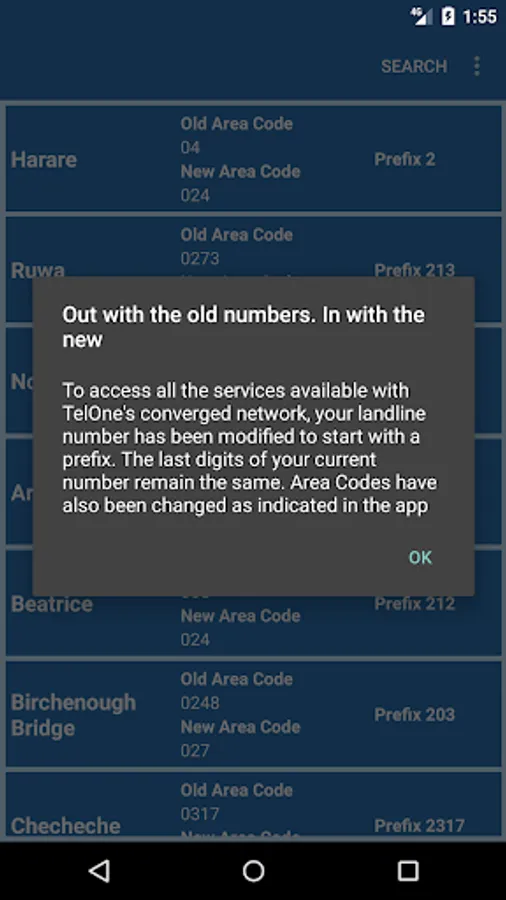 To access all the services available with TelOne's converged network, your landline number has been modified to start with a prefix. The last digits of your current number remain the same. Area Codes have also been changed as indicated in the app