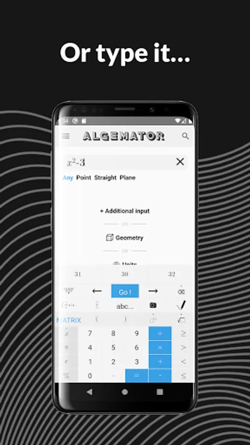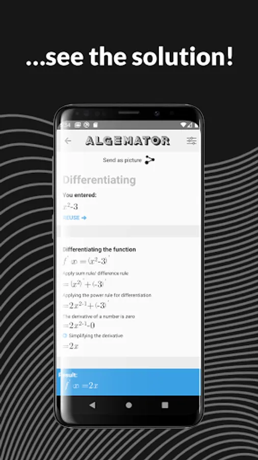 The Algemator solves your math tasks. Not only that but it also gives you the step-by-step solutions. The Algemator offers a wide range of functionality, from basics like manual addition or equation solving, to more advanced functionalities like functions or matrices. The Algemator even supports geometric forms. Just enter what you know about the form and the Algemator will calculate the rest!