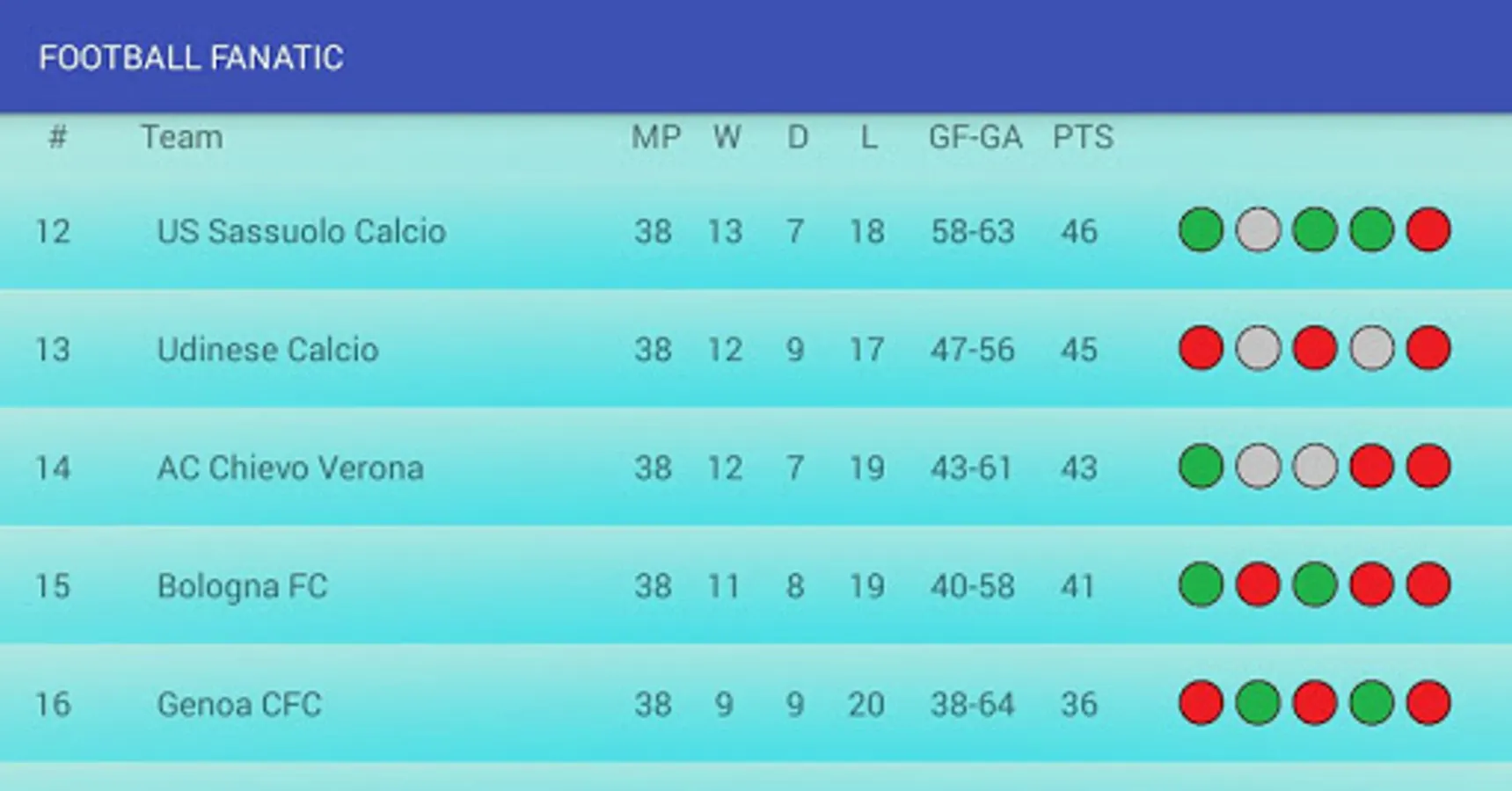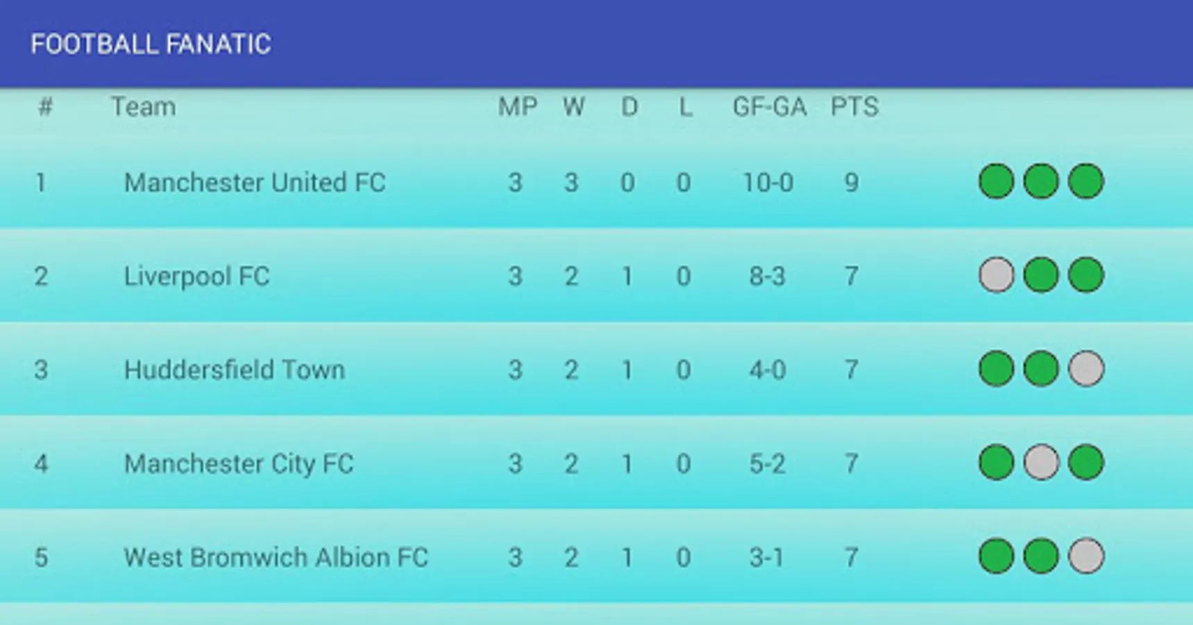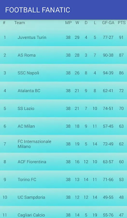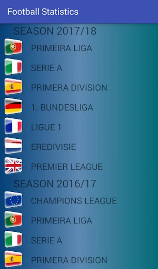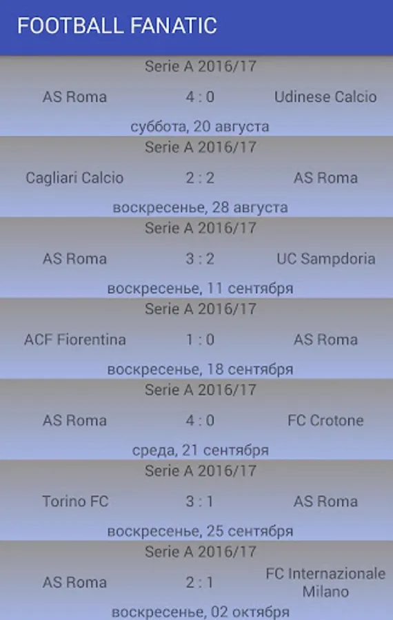 Football fanatic is comfortable app given detailed information about confrontation in seven football leagues of European (moreover League of Champions is not excluded). App afford obtain last results of confrontation between teams, detailed statistics, calendar of meetings. The obtained data will be conserve in database, so do not worry, last conserved results will be afford always. Stop ruminate, install it up!