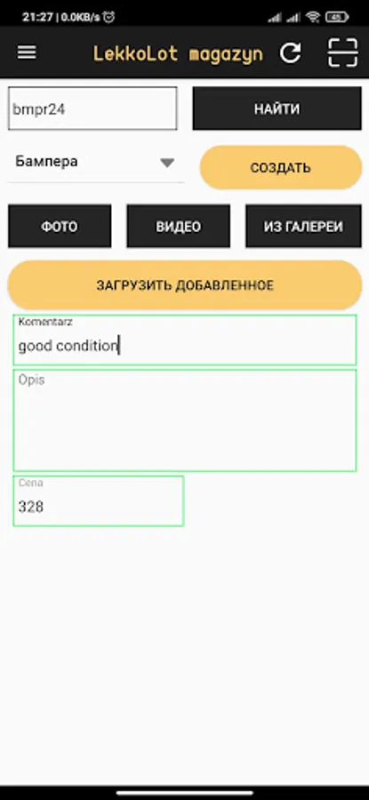 The LekkoLot magazyn application is part of the LekkoLot system, which is intended for quick creation and basic management of announcements, mostly intended for warehouse workers. Allows you to create ads, upload photos and videos, provide additional information, print barcode labels using a printer, scan barcodes and delete ads that are no longer in stock